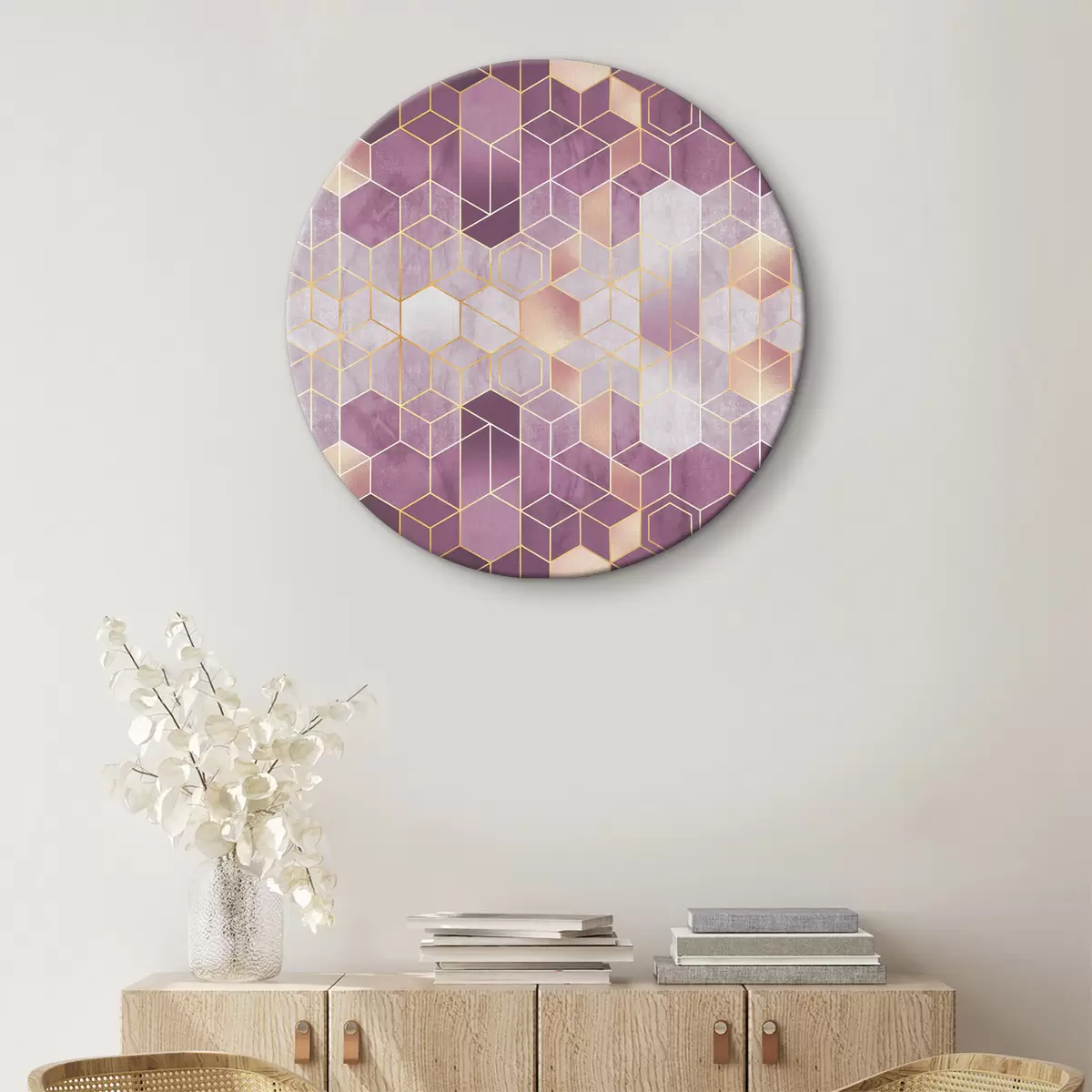 Ronde schilderijen Elegant zeshoekig patroon in paarse tinten Nr r36602v1