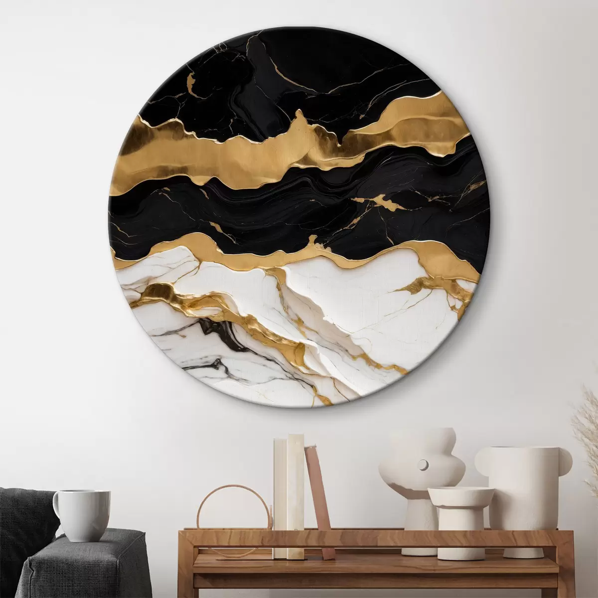 Ronde schilderijen Zwart-wit abstractie op marmer met gouden lijn r36636