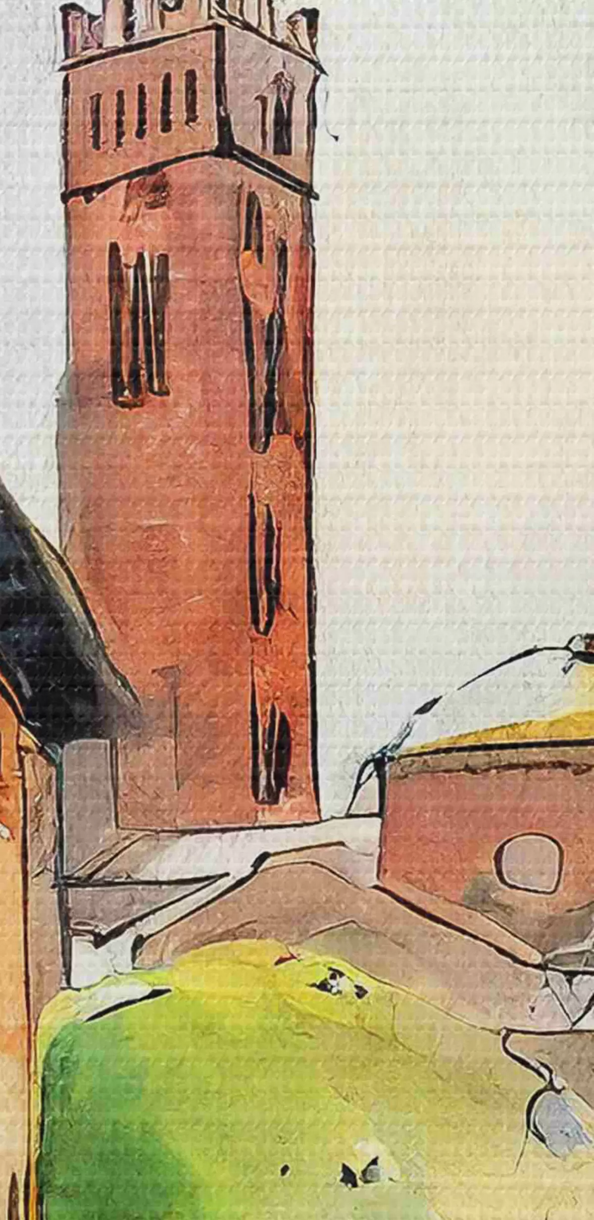 Ronde schilderijen Een aquarelschilderij van een straat met gebouwen en bomen Nr r36684