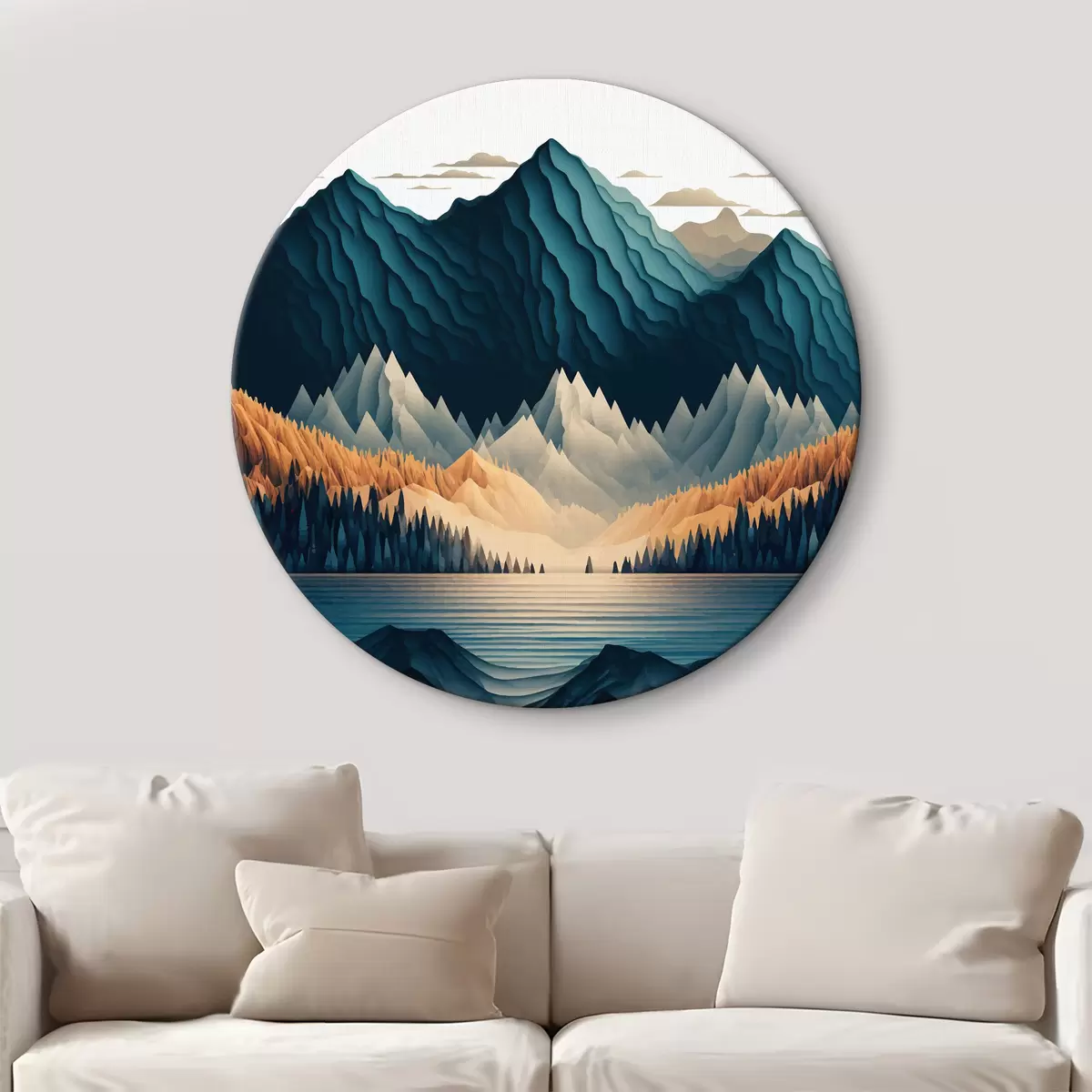 Ronde schilderijen Bergketen met bomen en meer r36697