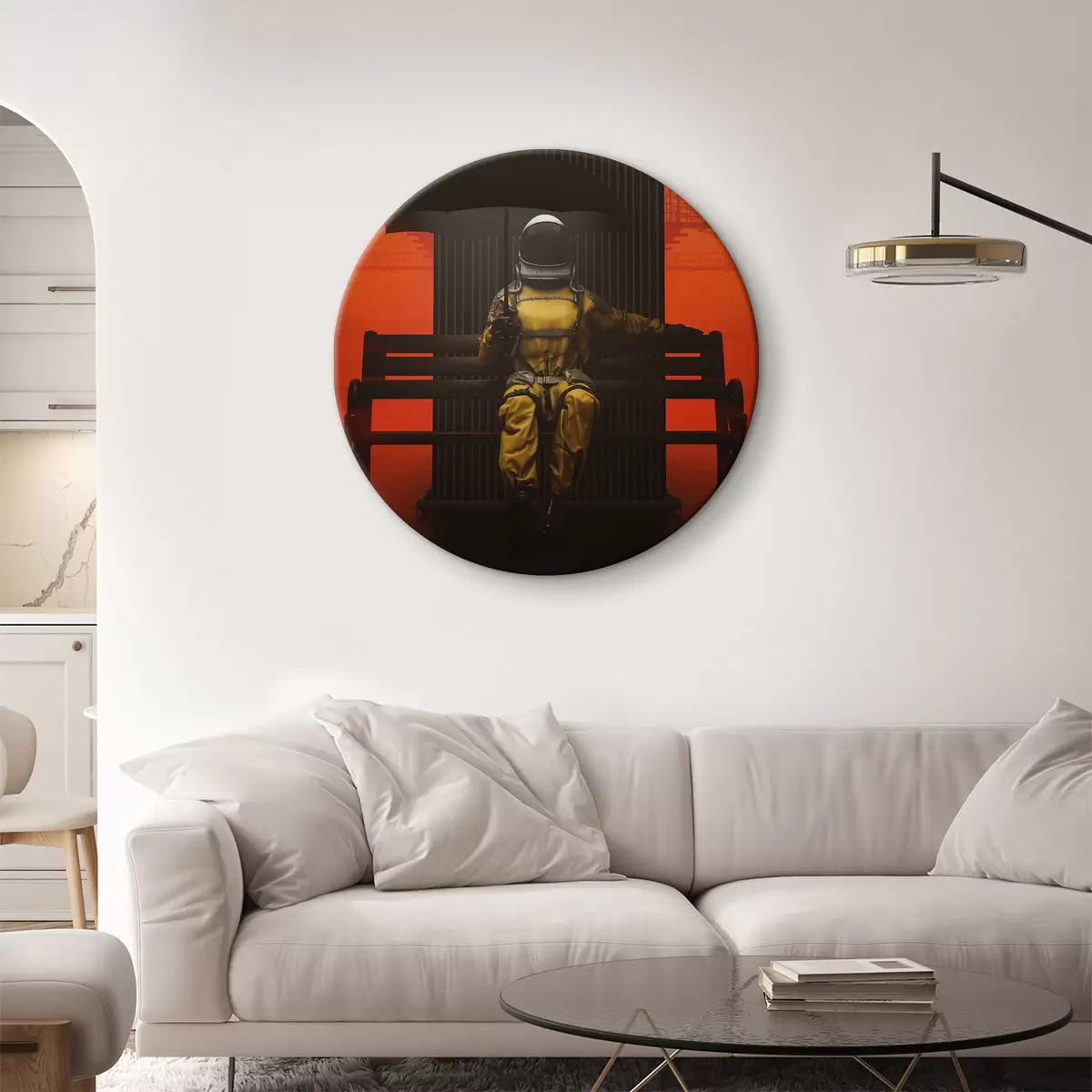 Ronde schilderijen Een persoon in een pak zittend op een bankje met een paraplu r36702
