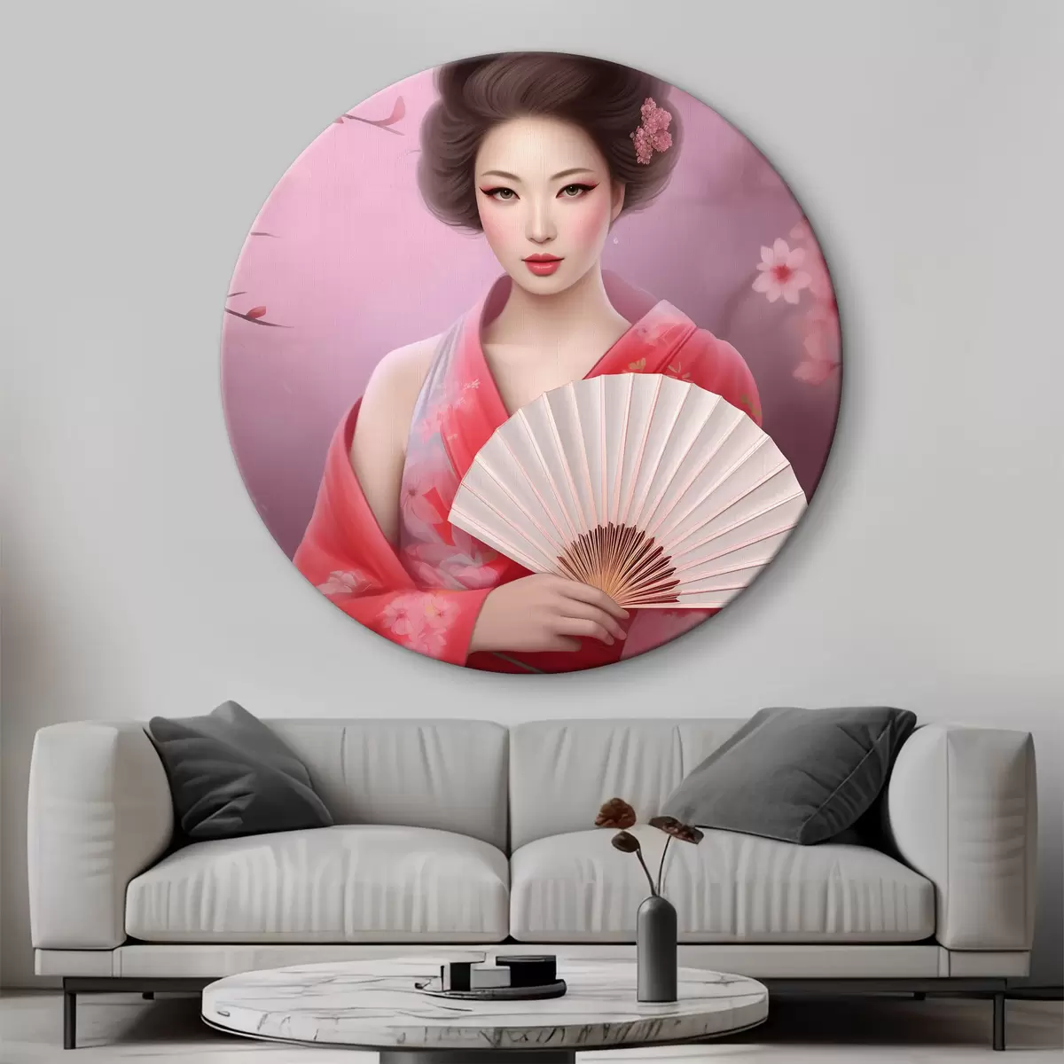 Ronde schilderijen Een vrouw in een kimono die een waaier vasthoudt Nr r36804