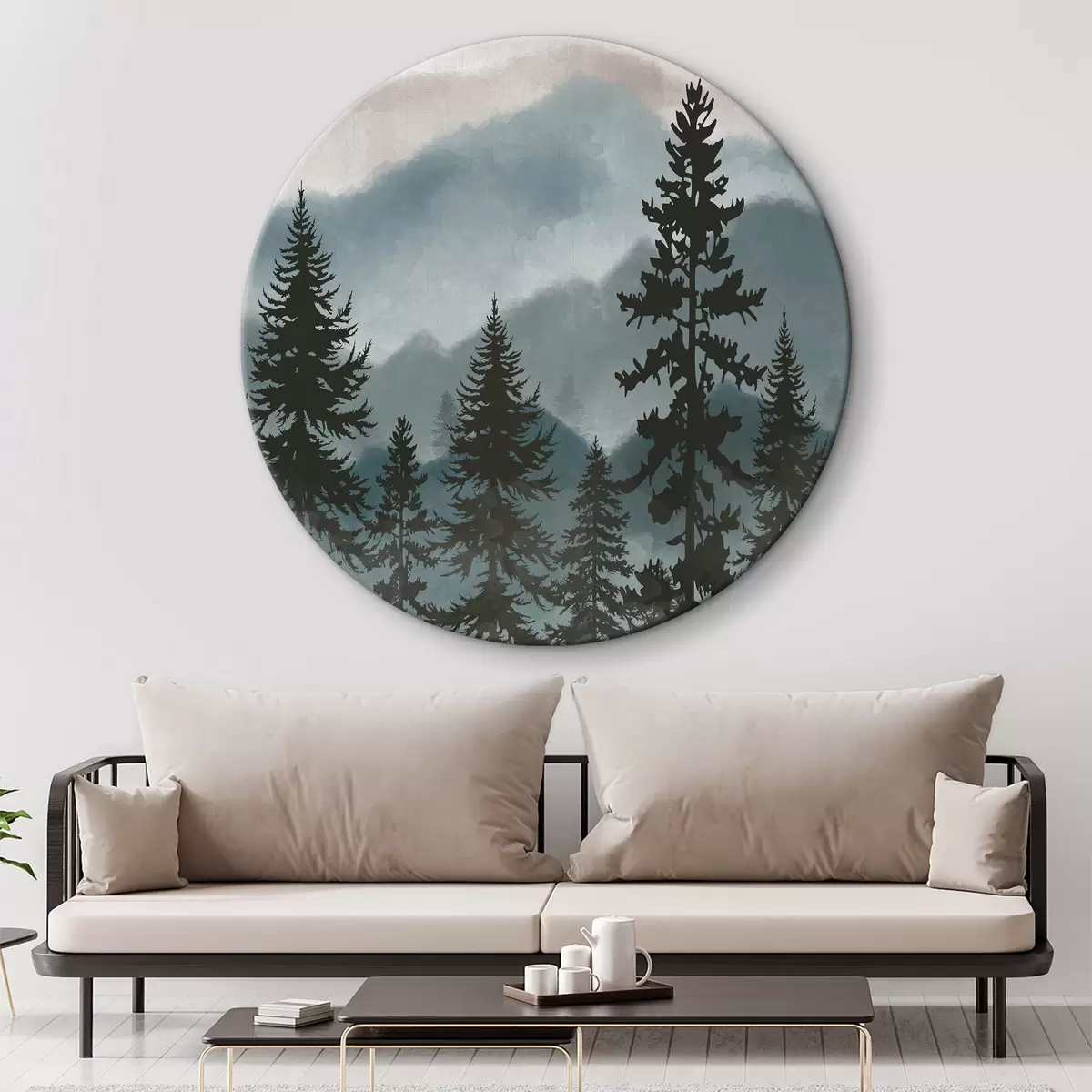 Ronde schilderijen Berglandschap met dennenbomen in aquarel Nr r37017