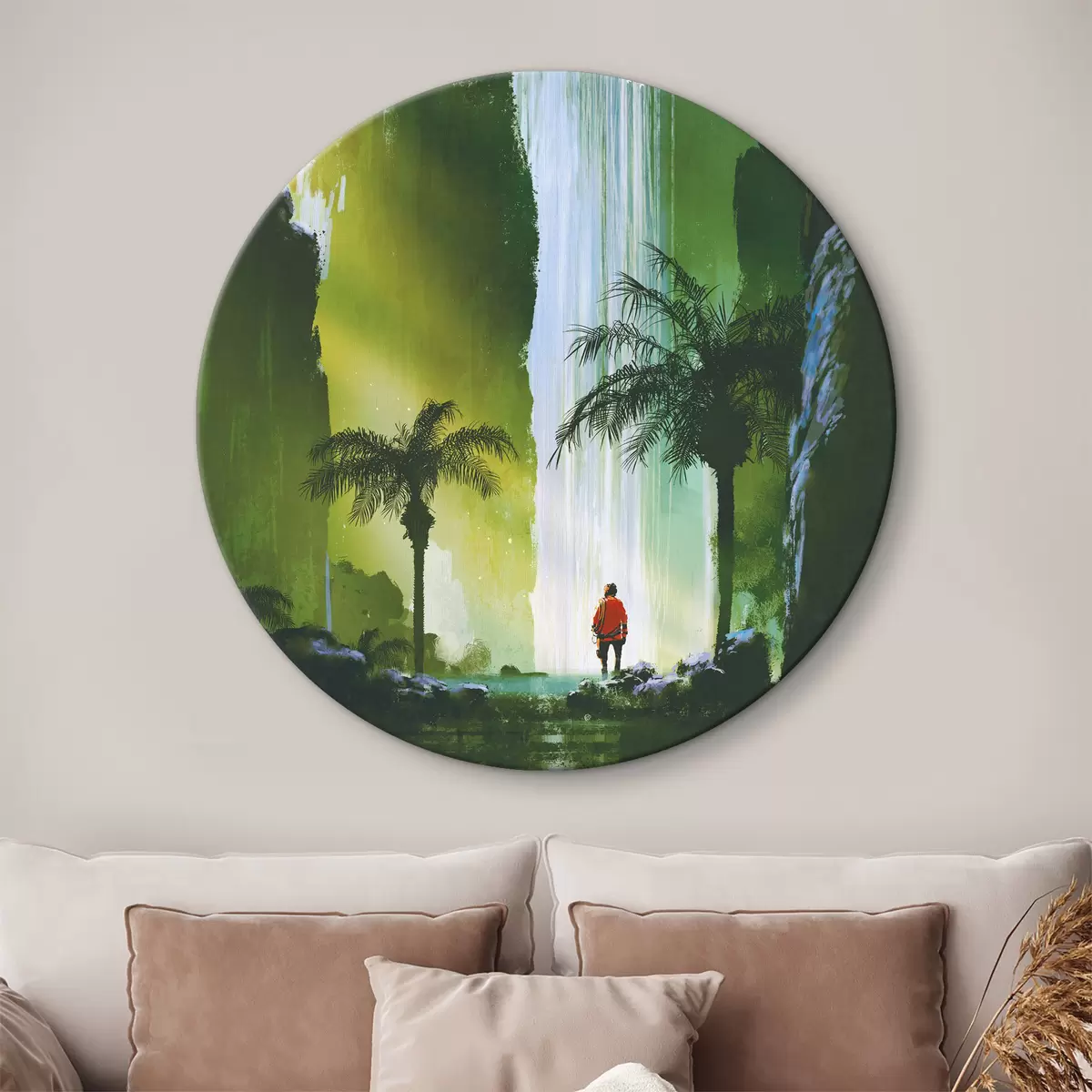Ronde schilderijen Een man loopt in het bos met een waterval Nr r37080