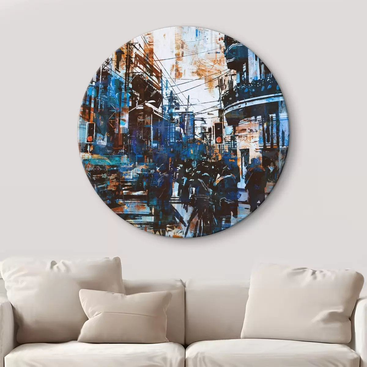 Ronde schilderijen Straat met gebouwen en mensen Nr r37087