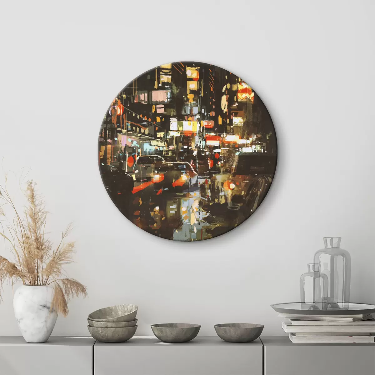 Ronde schilderijen Stadsstraat met auto's en lichten Nr r37097
