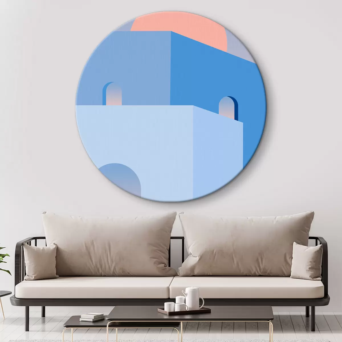 Ronde schilderijen Oosterse stijl architectuur, abstracte geometrische kunst, blauw, roze r37132
