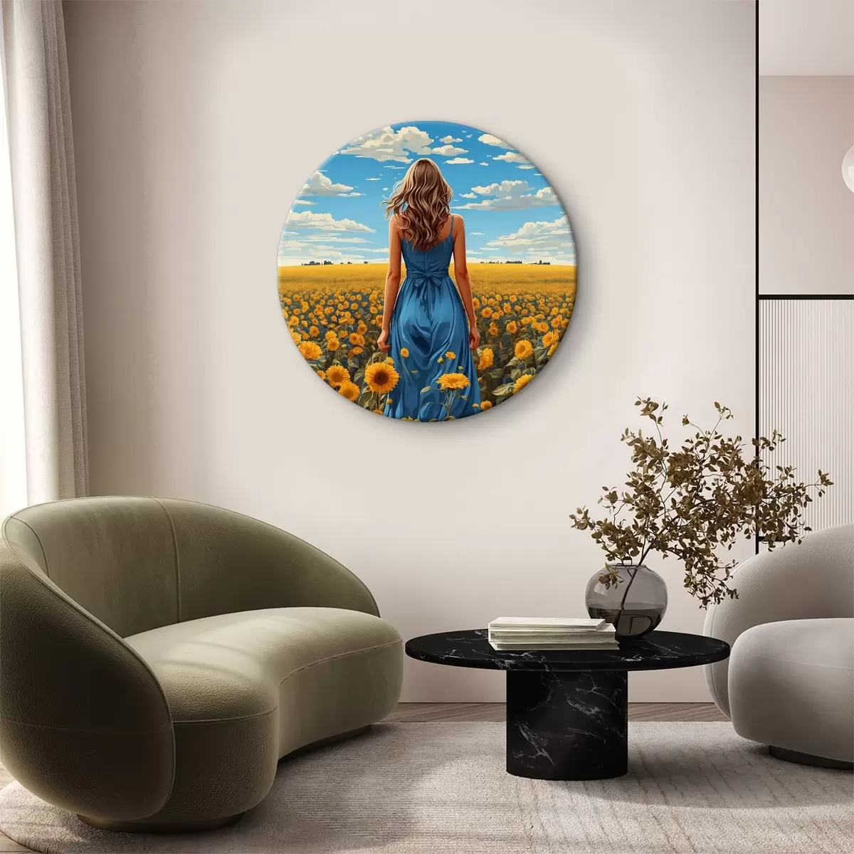Ronde schilderijen Vrouw in een blauwe jurk in een zonnebloemveld Nr r37164