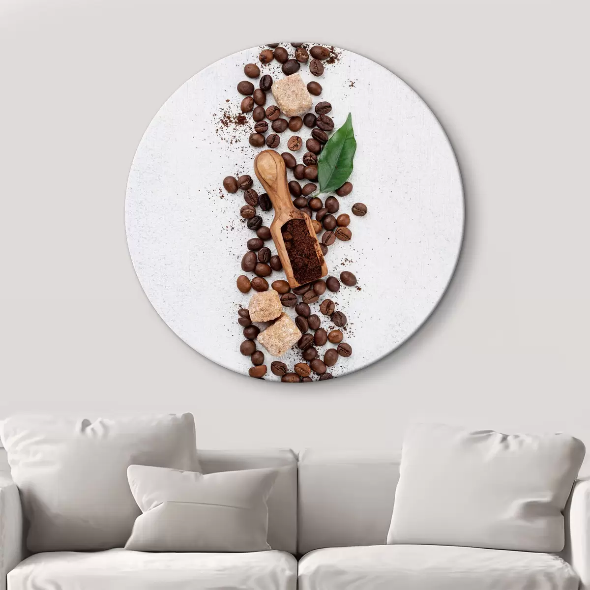 Ronde schilderijen Een lepel met koffiebonen en suiker erop Nr r37178