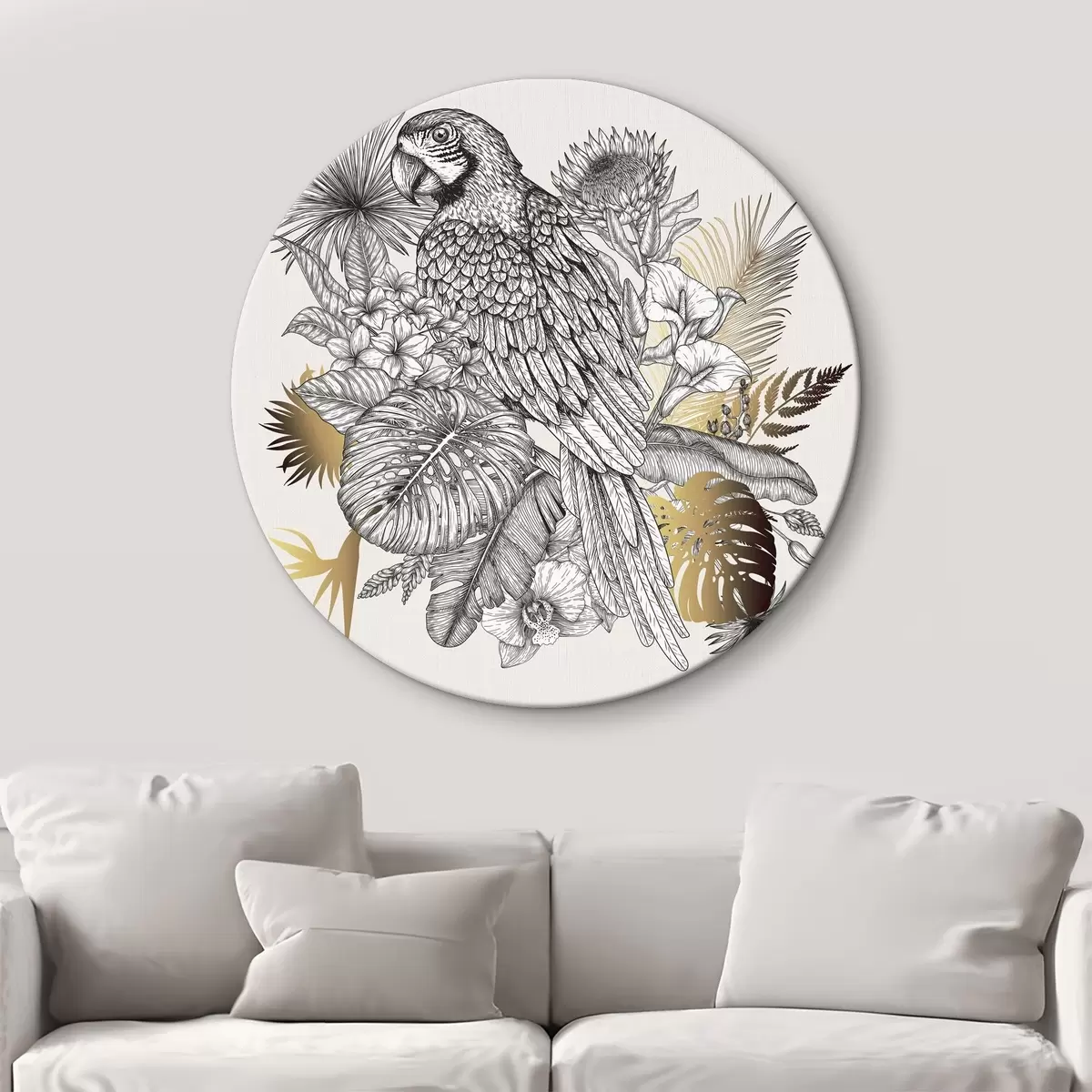 Ronde schilderijen Een vogel zittend op een tak met bladeren r37182
