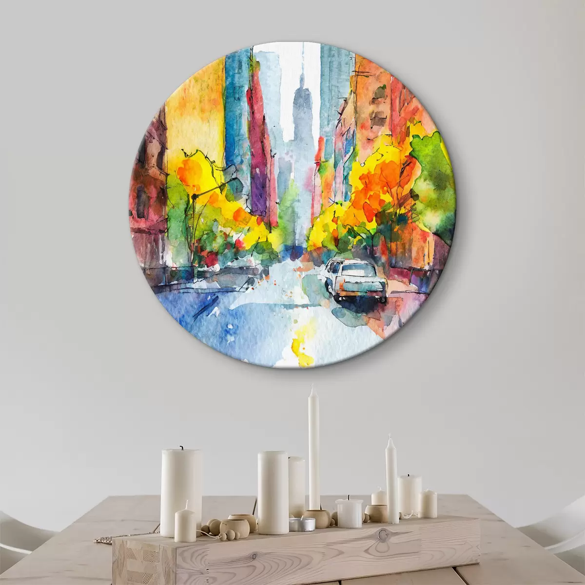 Ronde schilderijen New York aquarel, straten met wolkenkrabbers, abstracte kunst Nr r37345