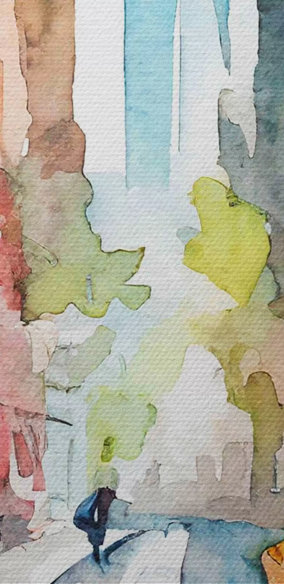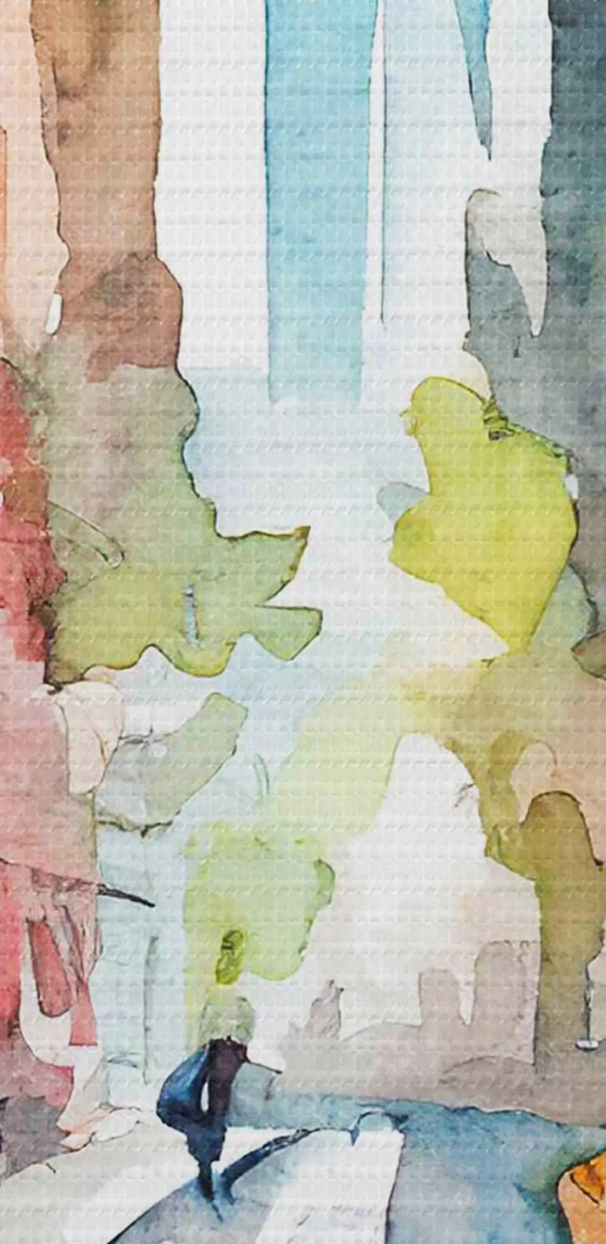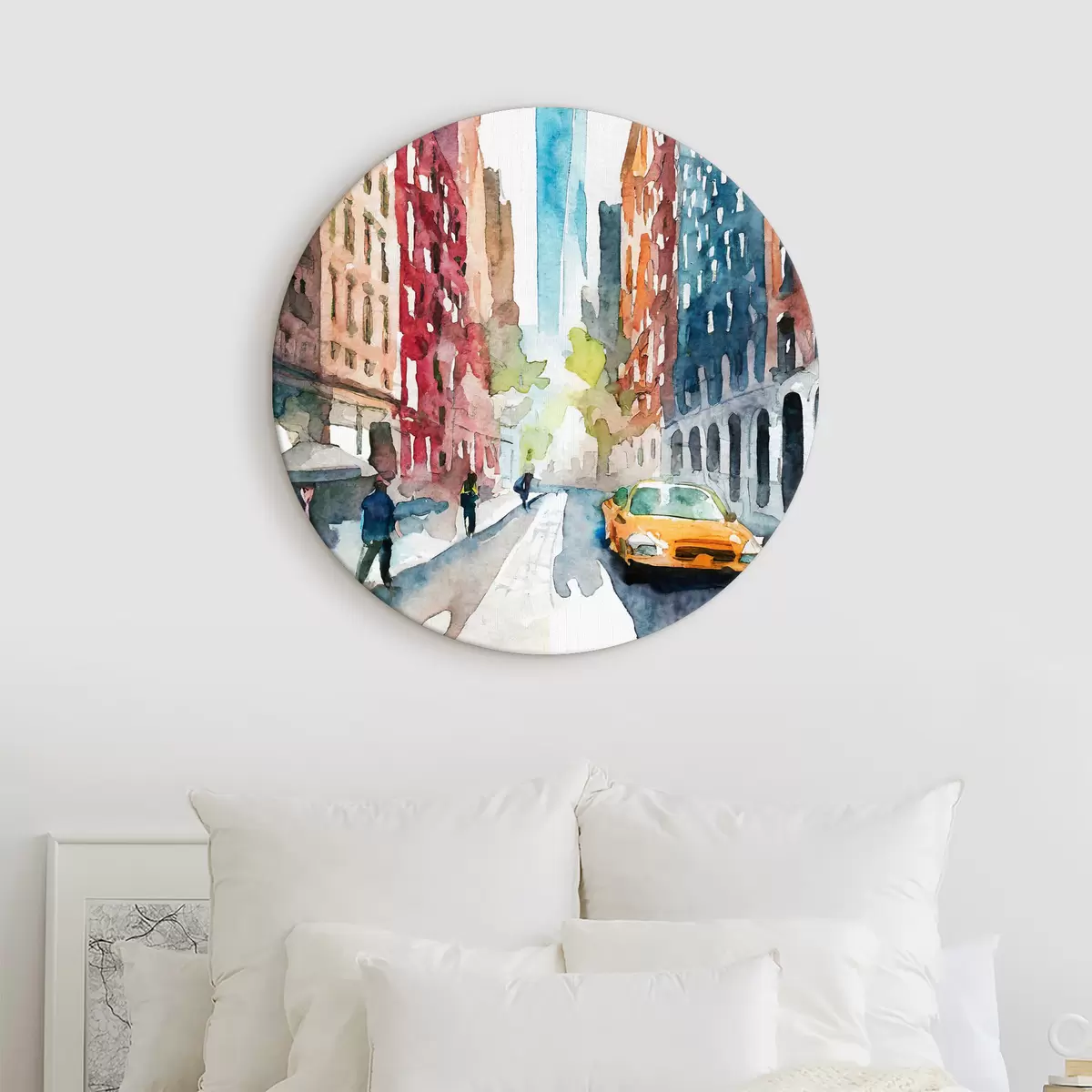 Ronde schilderijen Een aquarel van een straat met gebouwen en een hoge toren op de achtergrond Nr r37346