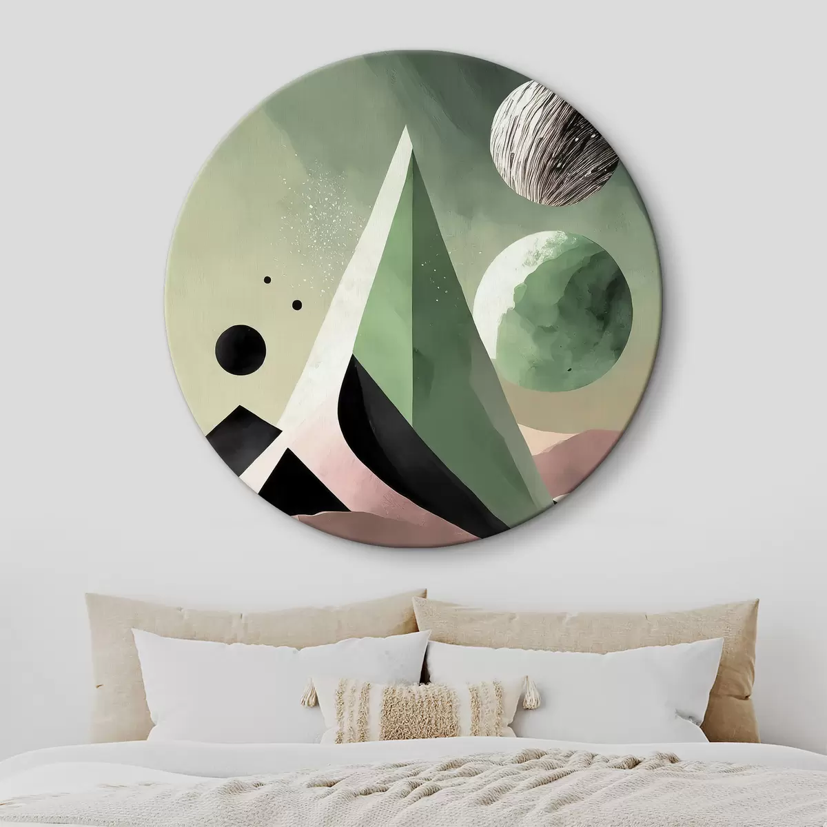 Ronde schilderijen Futuristische kunst, woestijn, geometrisch, cactus, zacht roze, kosmisch, planeten Nr r37364