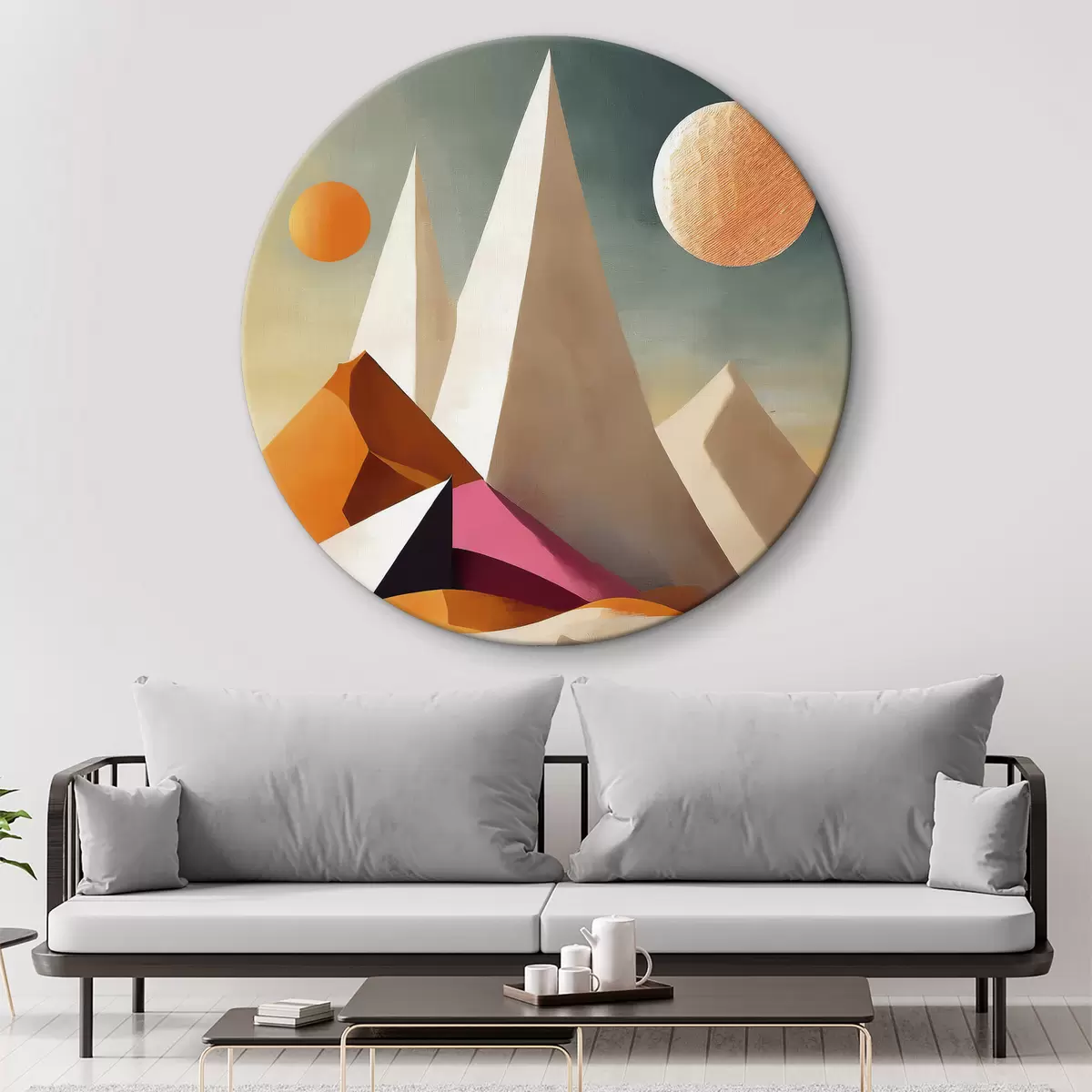 Ronde schilderijen Geometrische kunst, abstractie, roze en oranje, kosmisch, woestijn met rotsen r37370