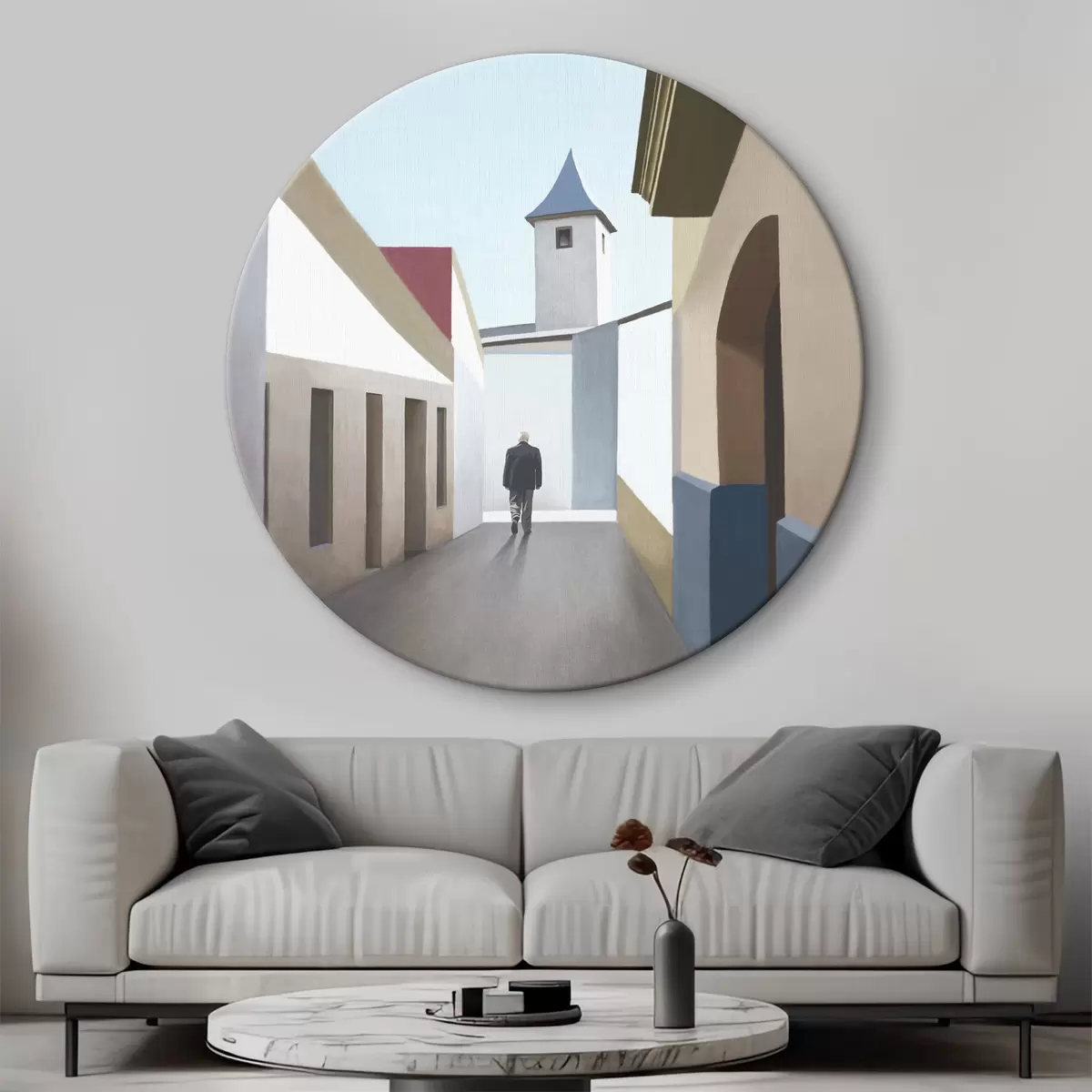 Ronde schilderijen Een man loopt door een smalle straat Nr r37784