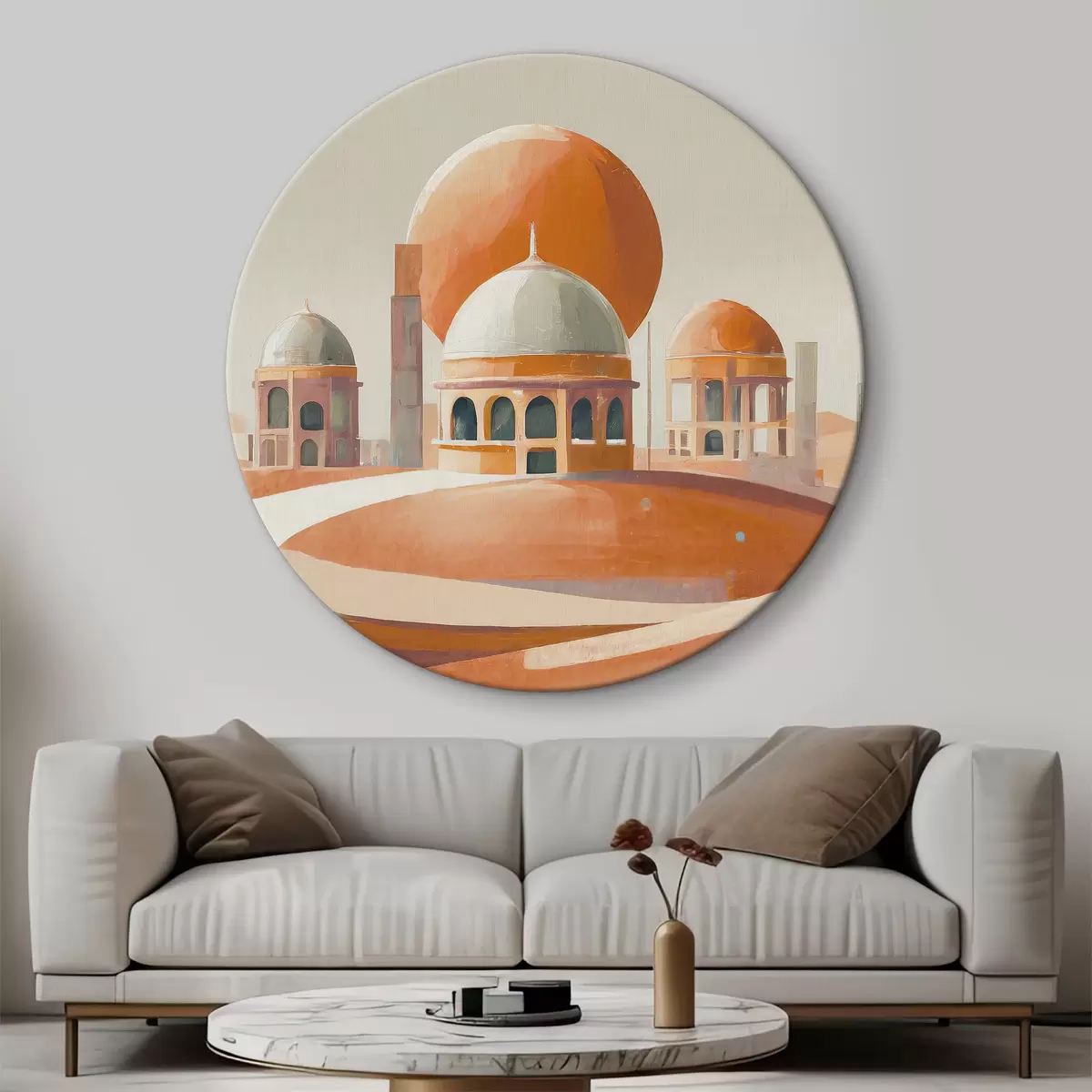 Ronde schilderijen Woestijnlandschap met gebouwen en een grote oranje bal Nr r37812