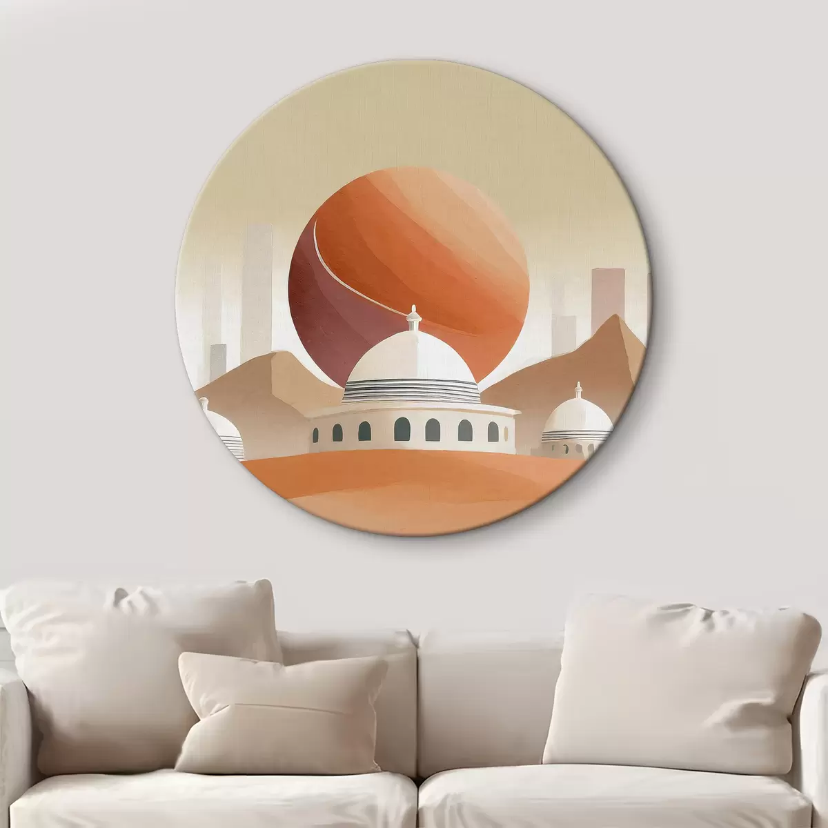 Ronde schilderijen Woestijnlandschap met gebouwen en een grote rode bal Nr r37817