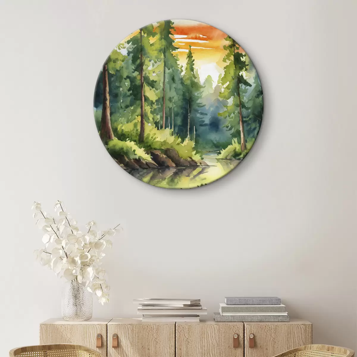 Ronde schilderijen Vredig bos bij een rustige rivier Nr r37948