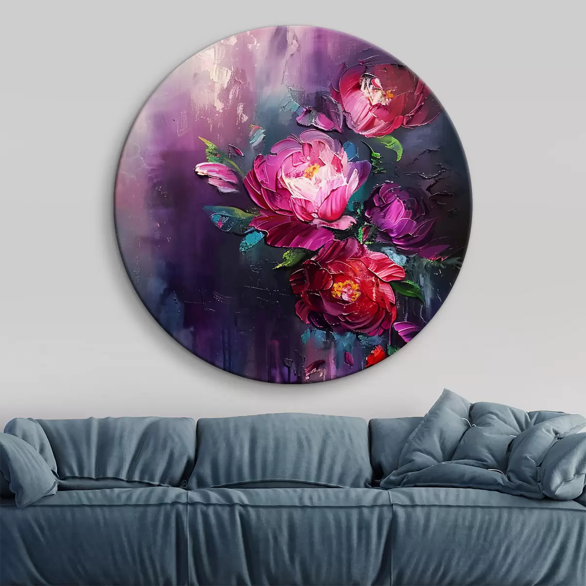 Ronde schilderijen Schilderij van rozen, bloeiende bloemen in olieverfstijl, op een donkerpaarse achtergrond Nr r38108