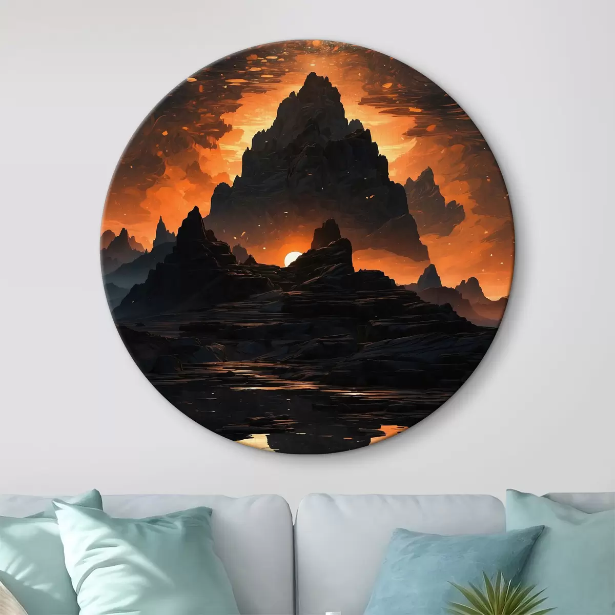 Ronde schilderijen Bergketen met daarachter de ondergaande zon Nr r38120