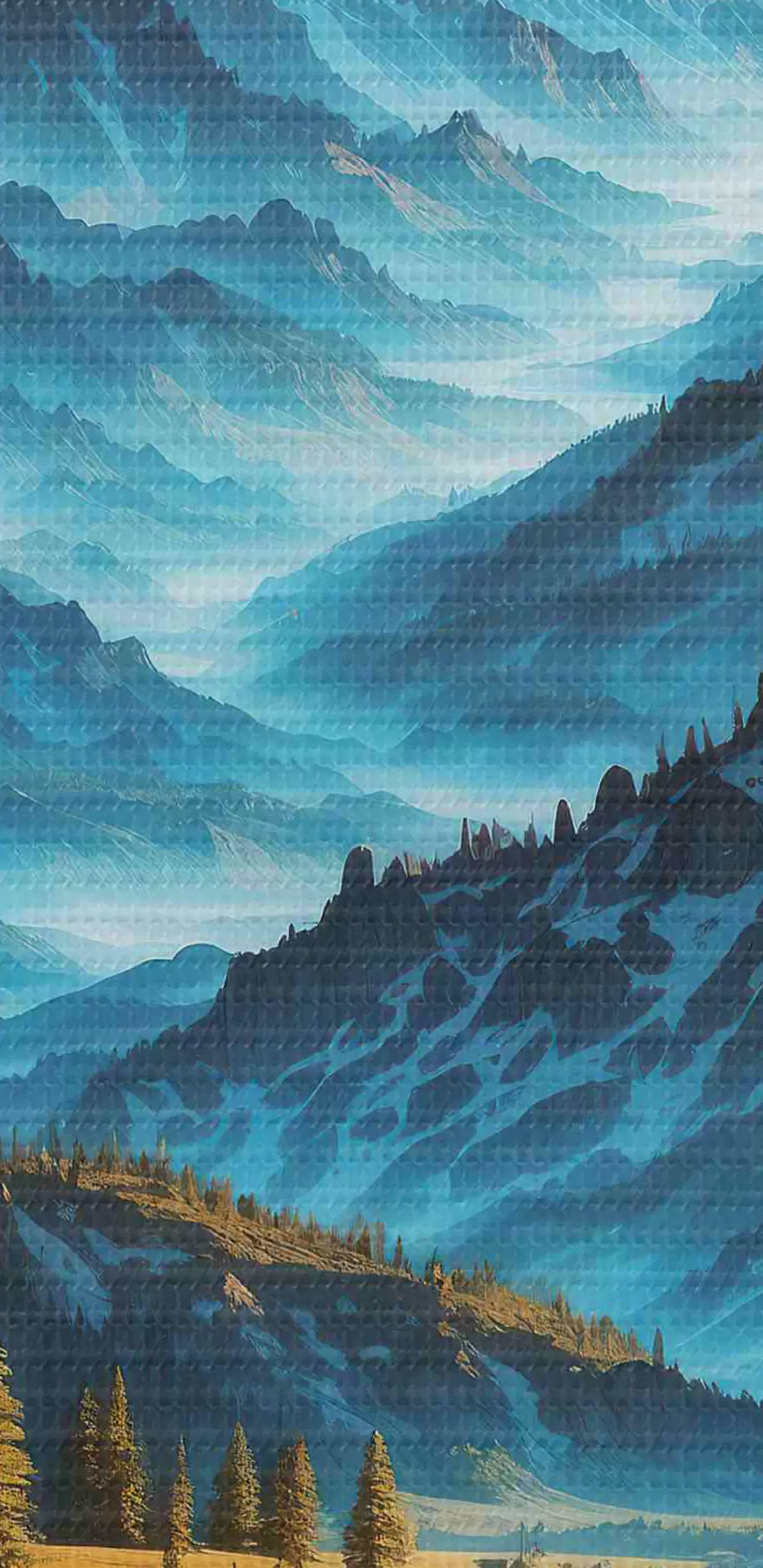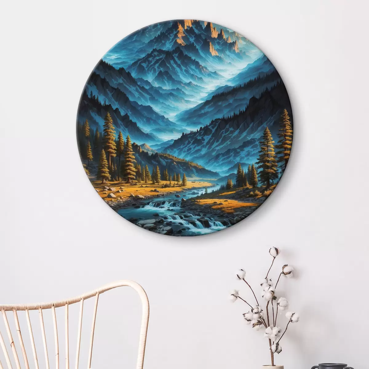Ronde schilderijen Bergketen met bomen en rivier Nr r38134