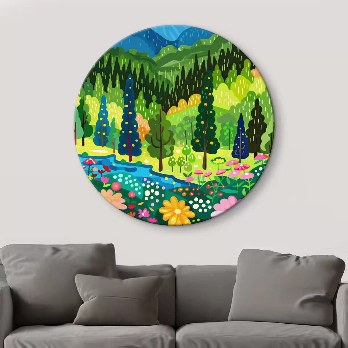 Ronde schilderijen Cartoonlandschap met bomen en bloemen Nr r38140