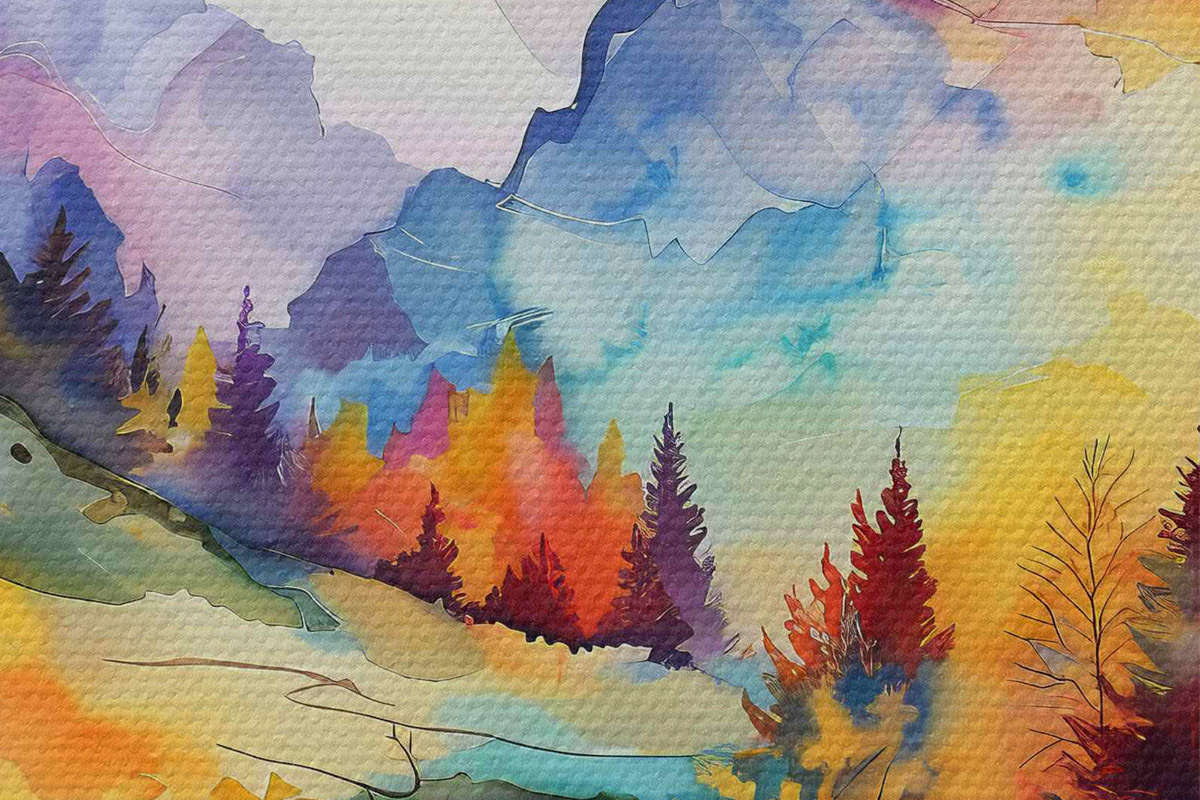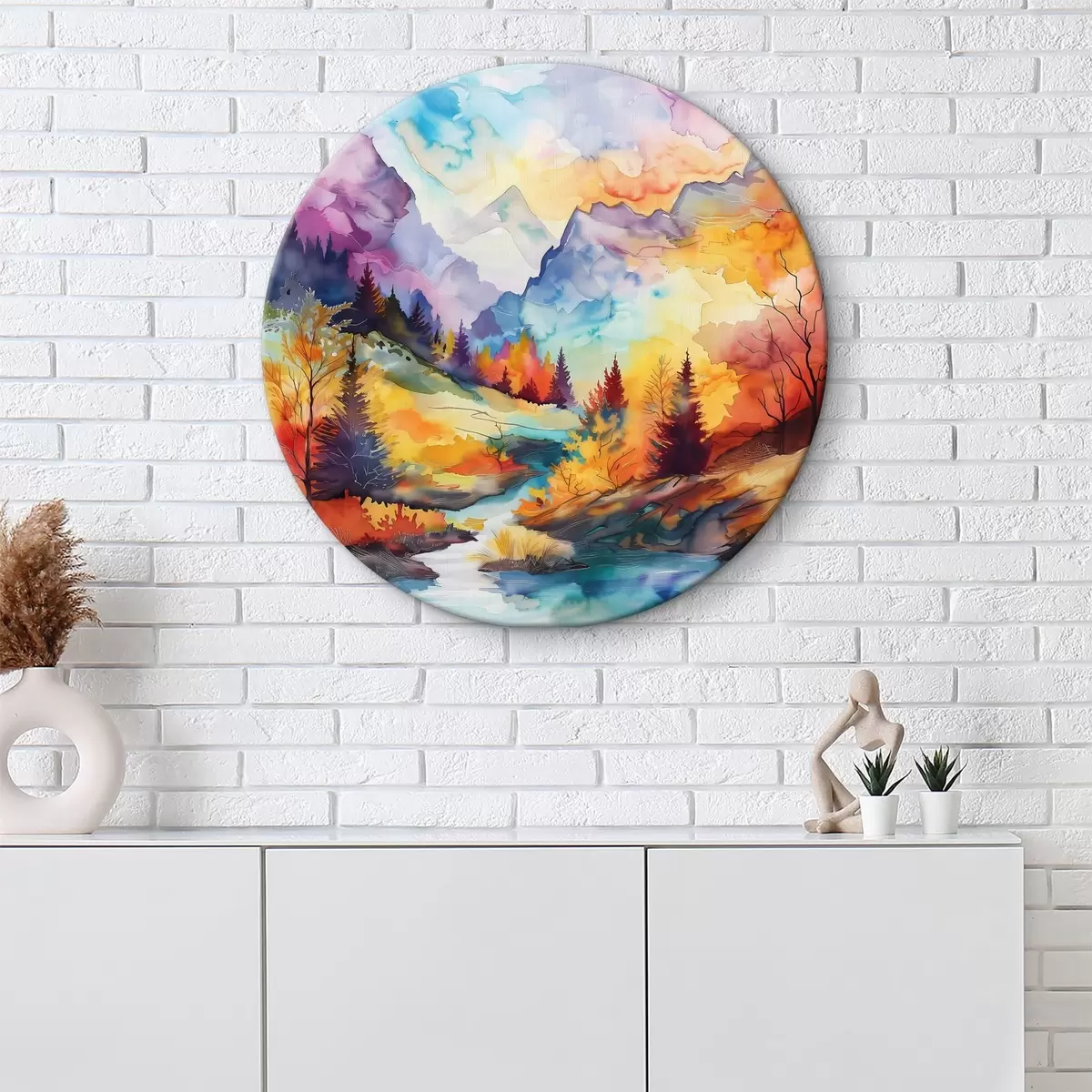 Ronde schilderijen Kleurrijk berglandschap met bomen en rivier Nr r38145