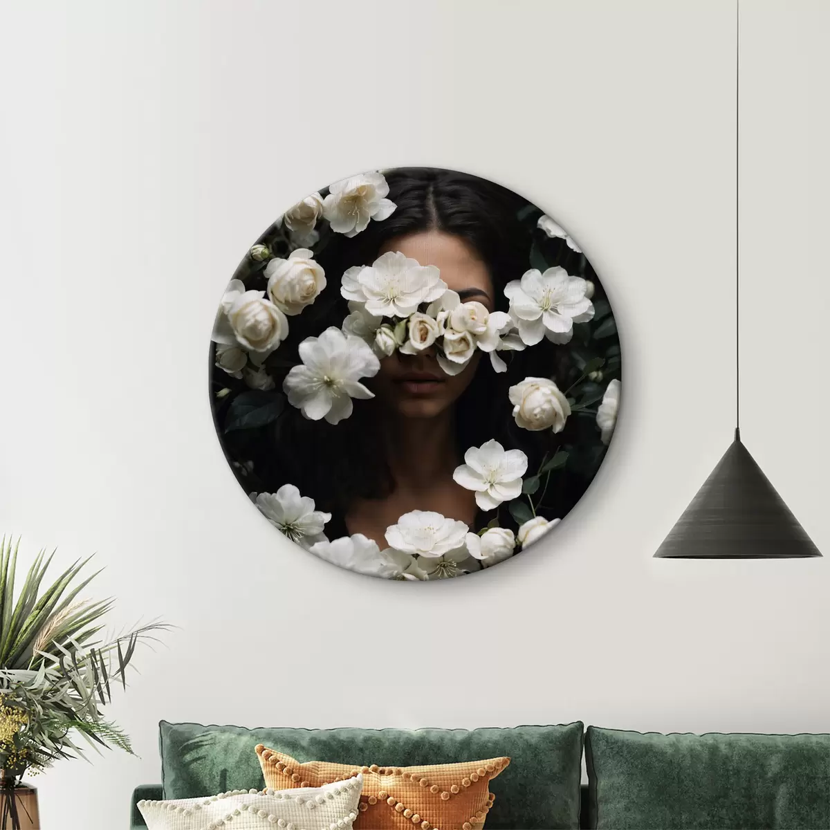 Ronde schilderijen Vrouw verbergt haar gezicht achter witte bloemen Nr r38194