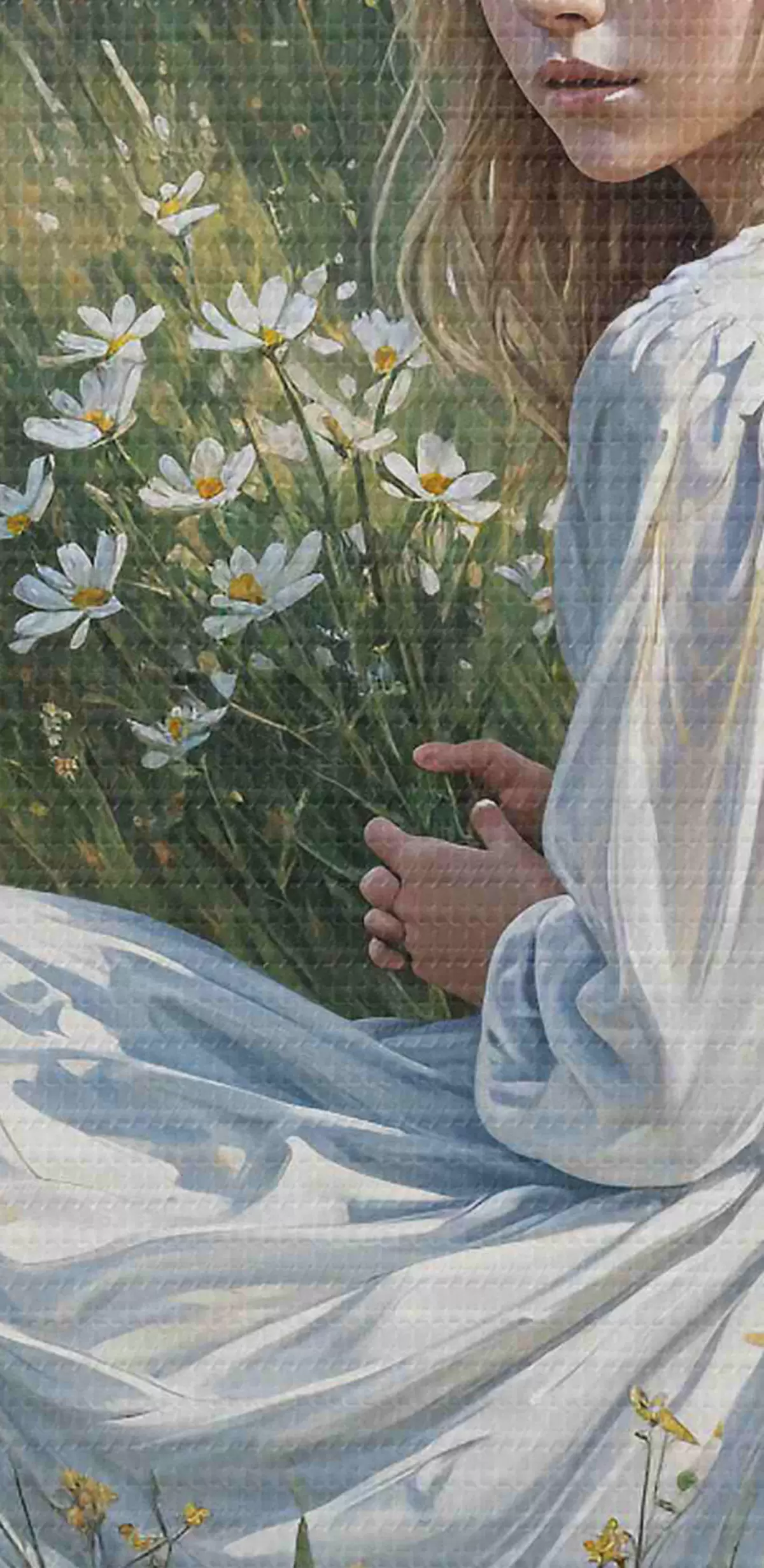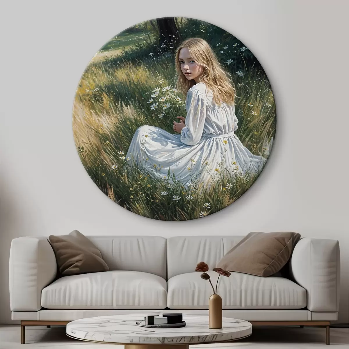 Ronde schilderijen Een meisje in een witte jurk zittend in een bloemenveld Nr r38196