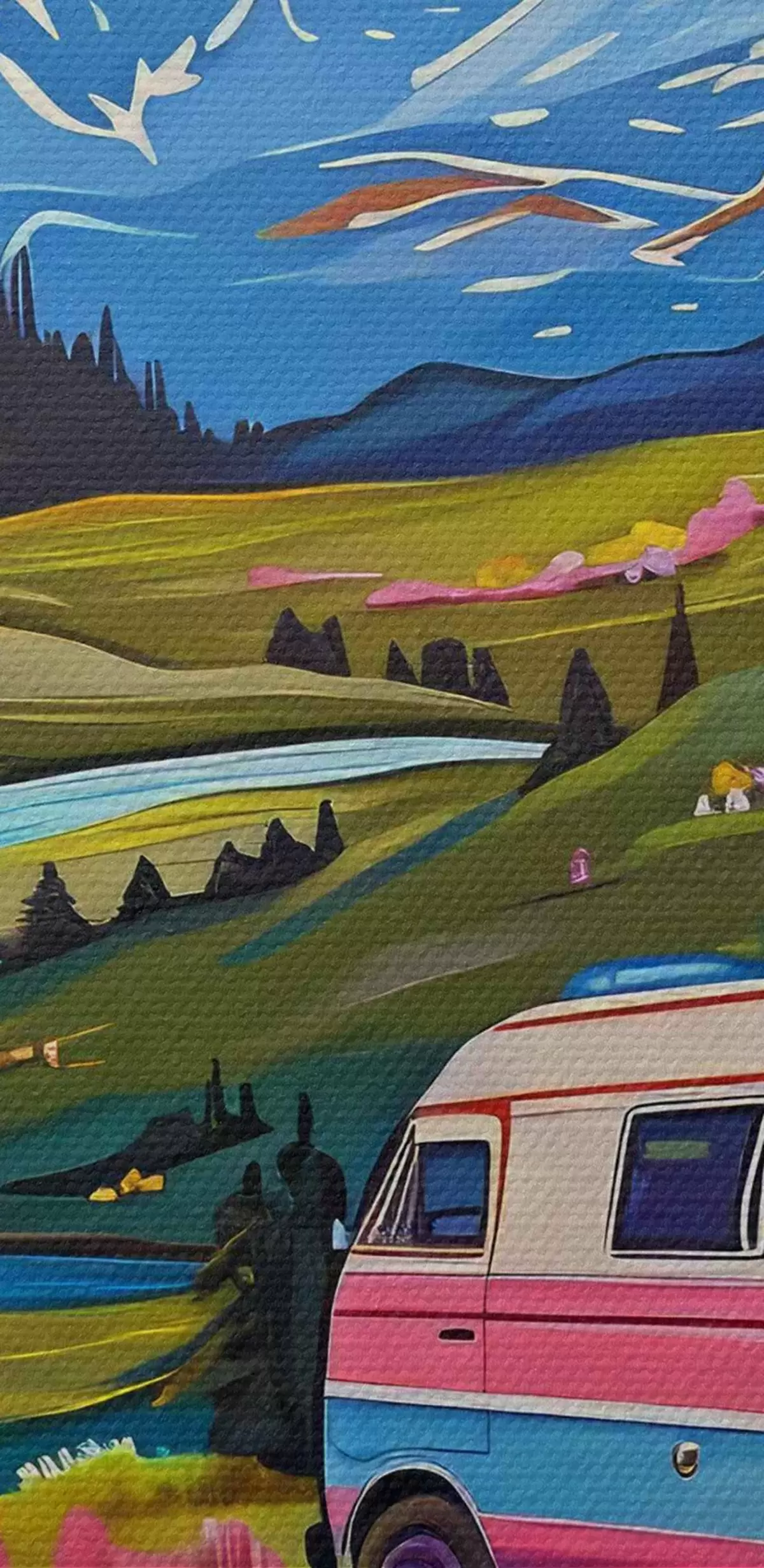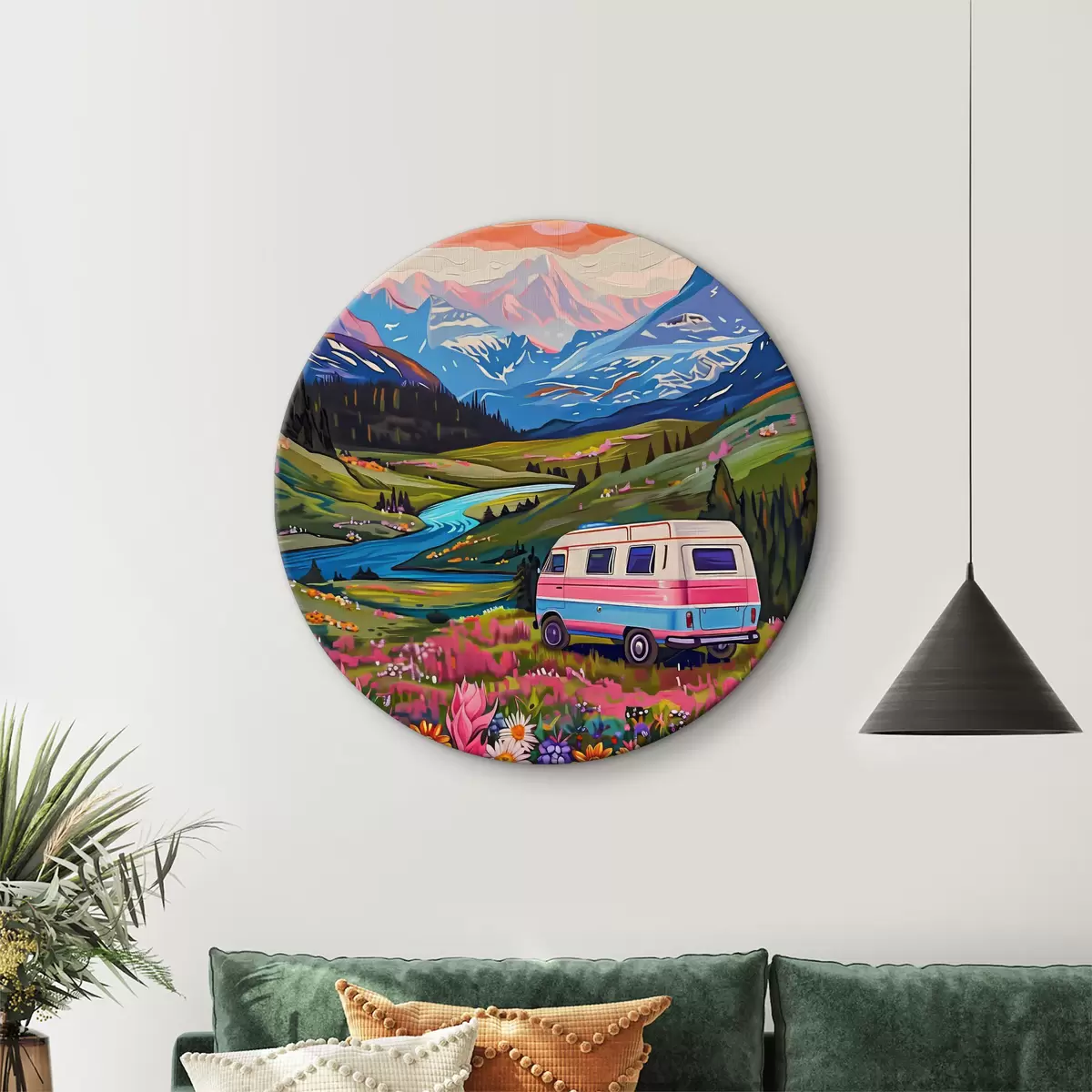 Ronde schilderijen Een busje rijdt door een vallei met bloemen en bergen r38259