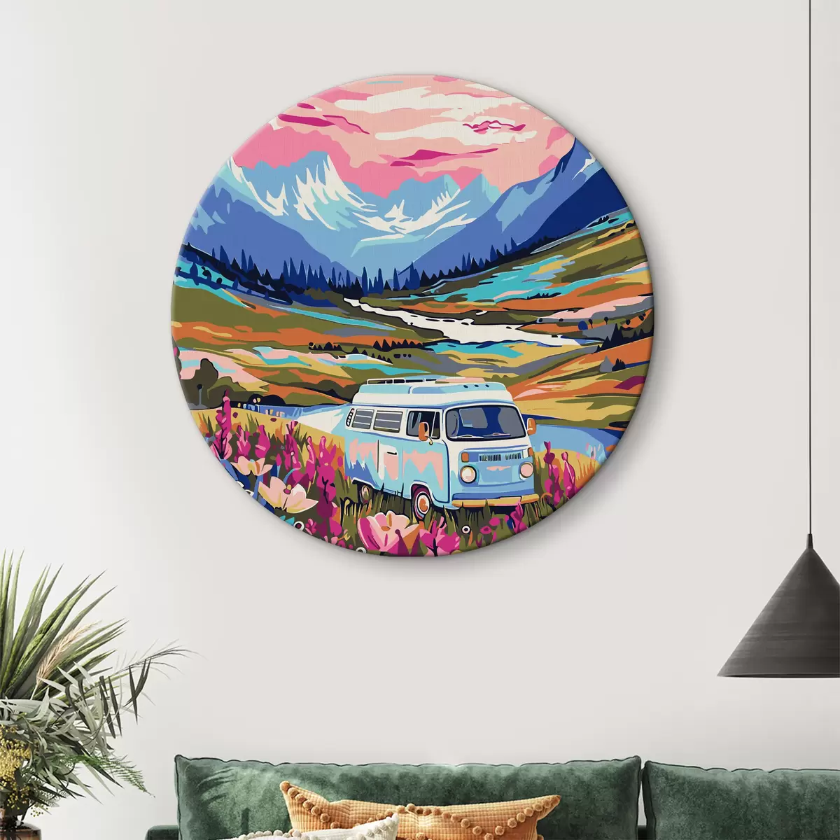 Ronde schilderijen Een busje rijdt door een bloemenveld Nr r38260