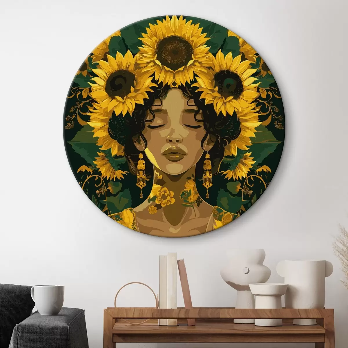 Ronde schilderijen Vrouw met zonnebloemen in haar haar r38263