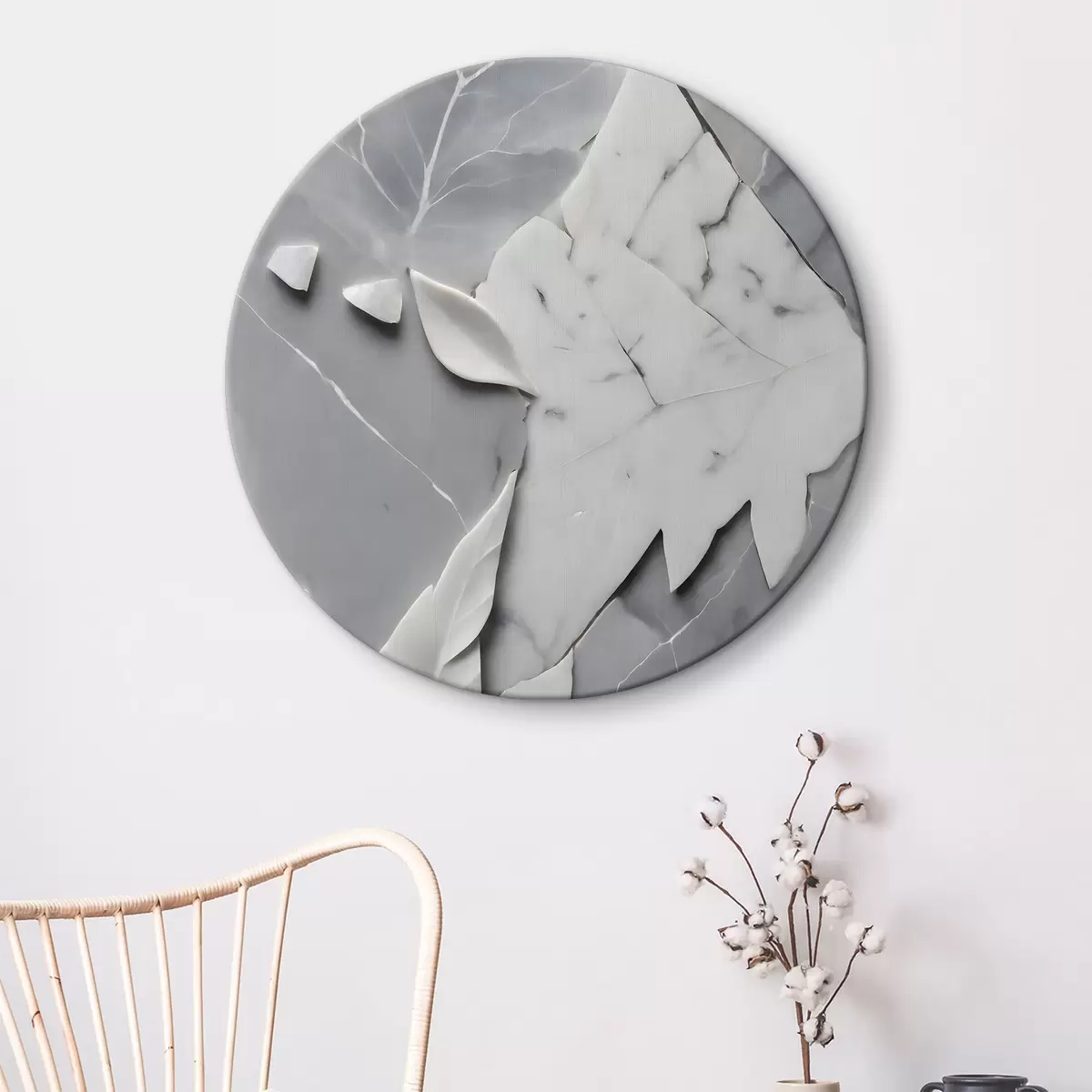 Ronde schilderijen Wit en grijs marmeren oppervlak met bladeren Nr r38272