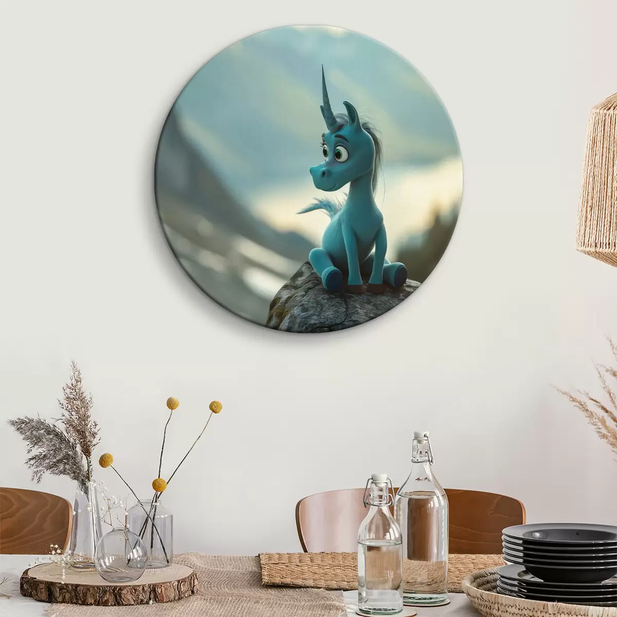 Ronde schilderijen Een tekening van een blauwe eenhoorn zittend op een rots Nr r38274