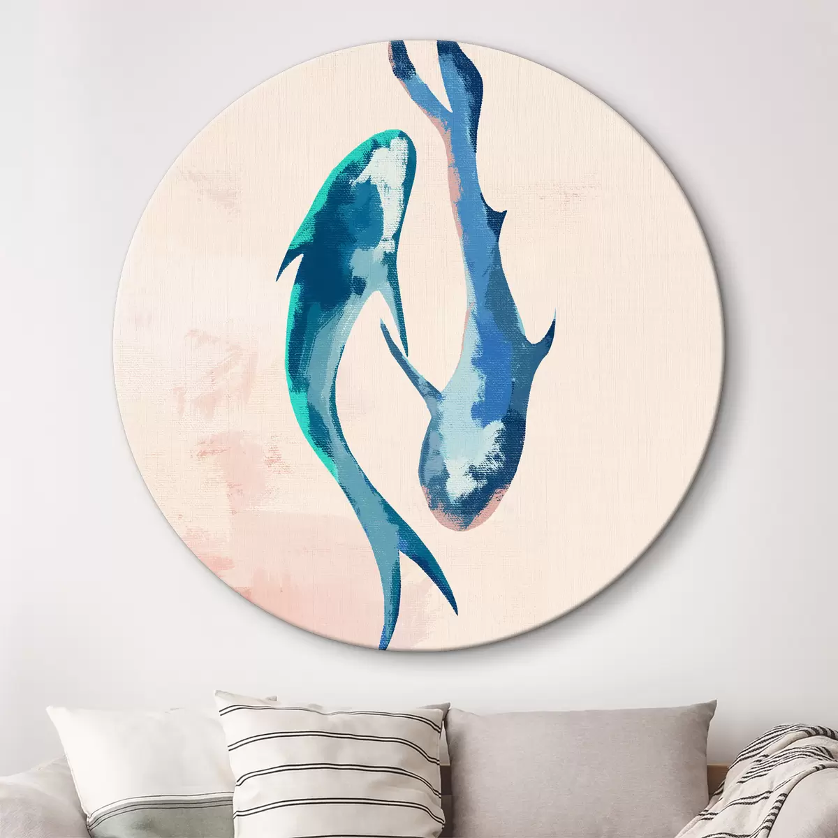 Ronde schilderijen Blauwe yin-yang vis op een roze achtergrond, minimalisme, imitatie olieverfschilderij, abstractie, blauwe en roze kleur Nr r38275