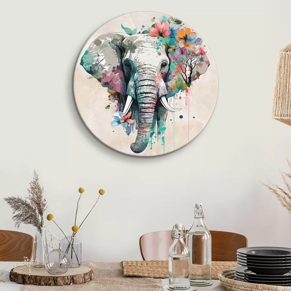Ronde schilderijen olifant in bloemen, verfvlekken Nr r38333