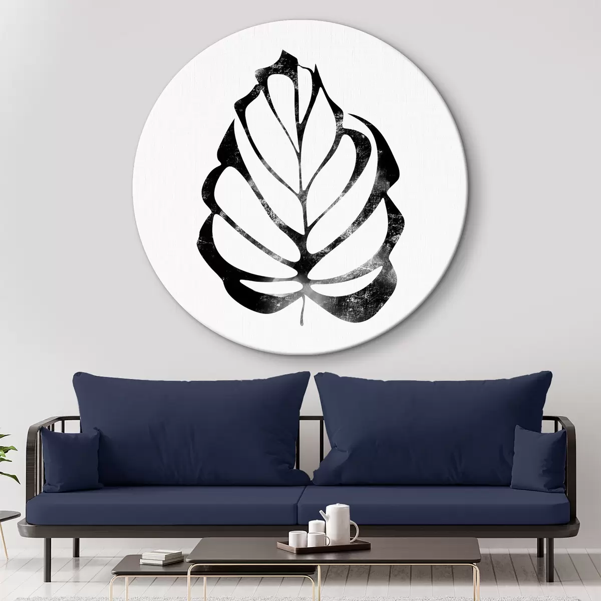 Ronde schilderijen Blad in zwart-wit Nr r38346