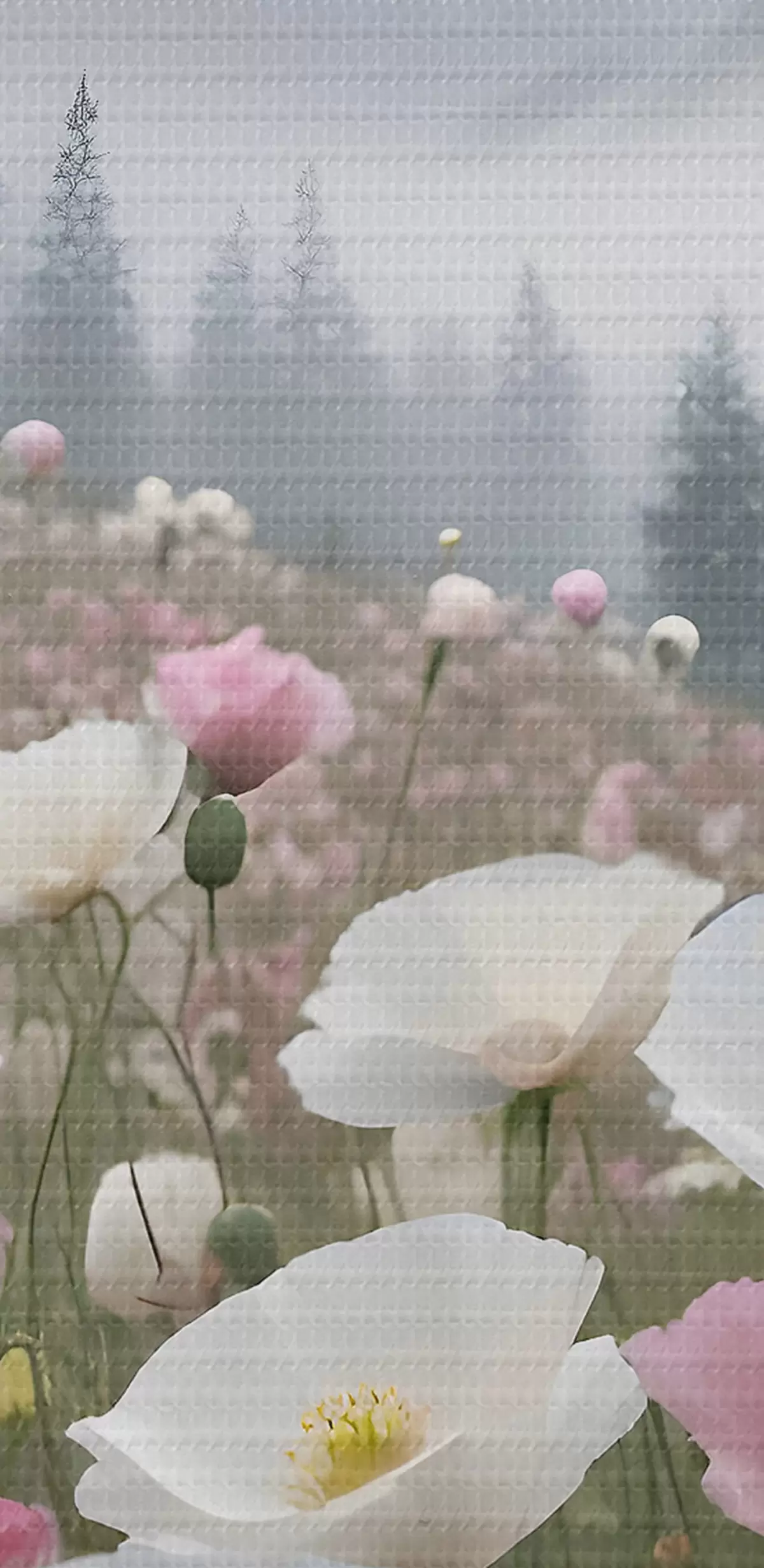 Ronde schilderijen Een veld met roze en witte klaprozen in het berglandschap op de achtergrond Nr r38369