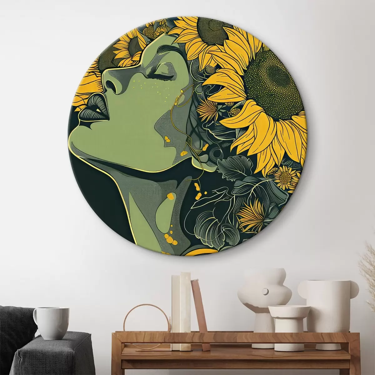 Ronde schilderijen Meisje in zonnebloemen op een groene achtergrond r38380