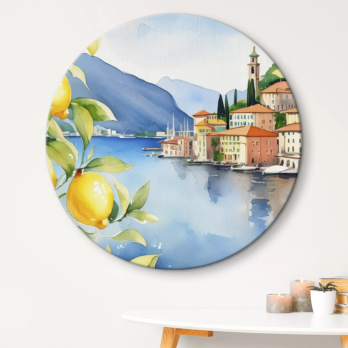 Ronde schilderijen Italiaans meer, zomer, aquarel, natuurlandschap, citroenen, stadsarchitectuur Nr r38397