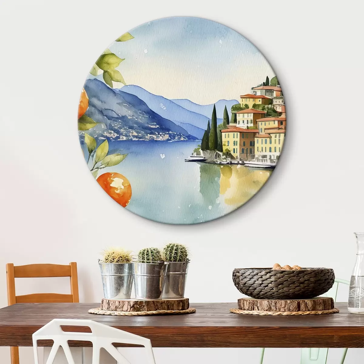 Ronde schilderijen Een aquarel van een stad aan de rand van een stuwmeer Nr r38402