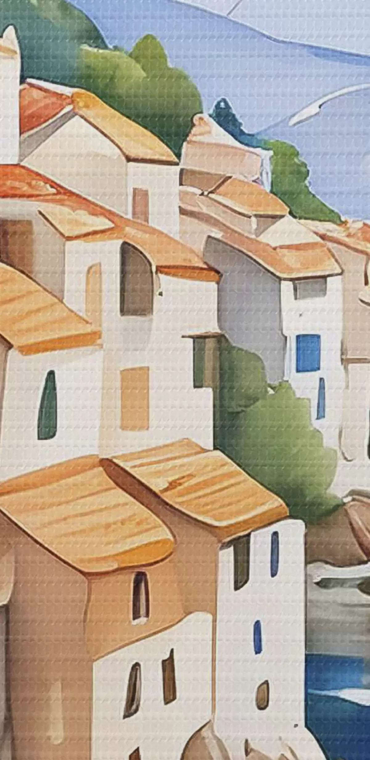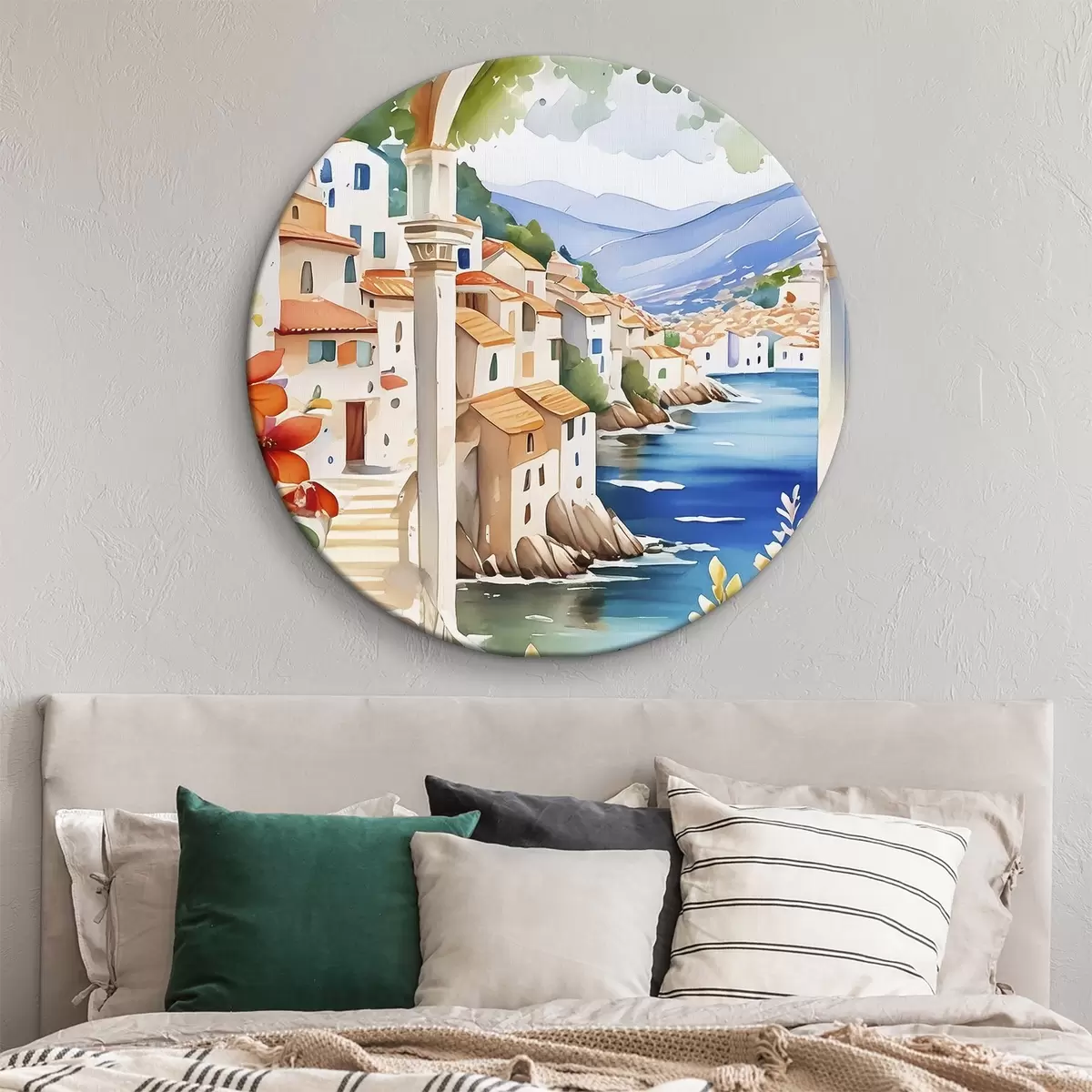 Ronde schilderijen Afbeelding van een stad met een rivier en bloemen Nr r38406