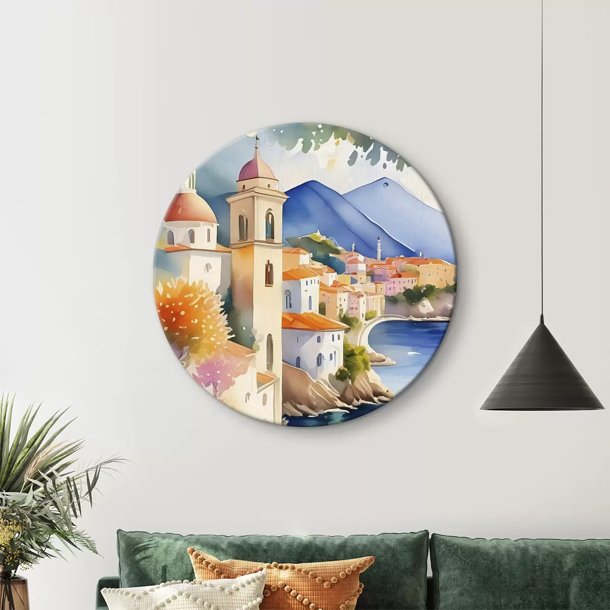 Ronde schilderijen Een aquarel van een stad aan de rand van een stuwmeer Nr r38407