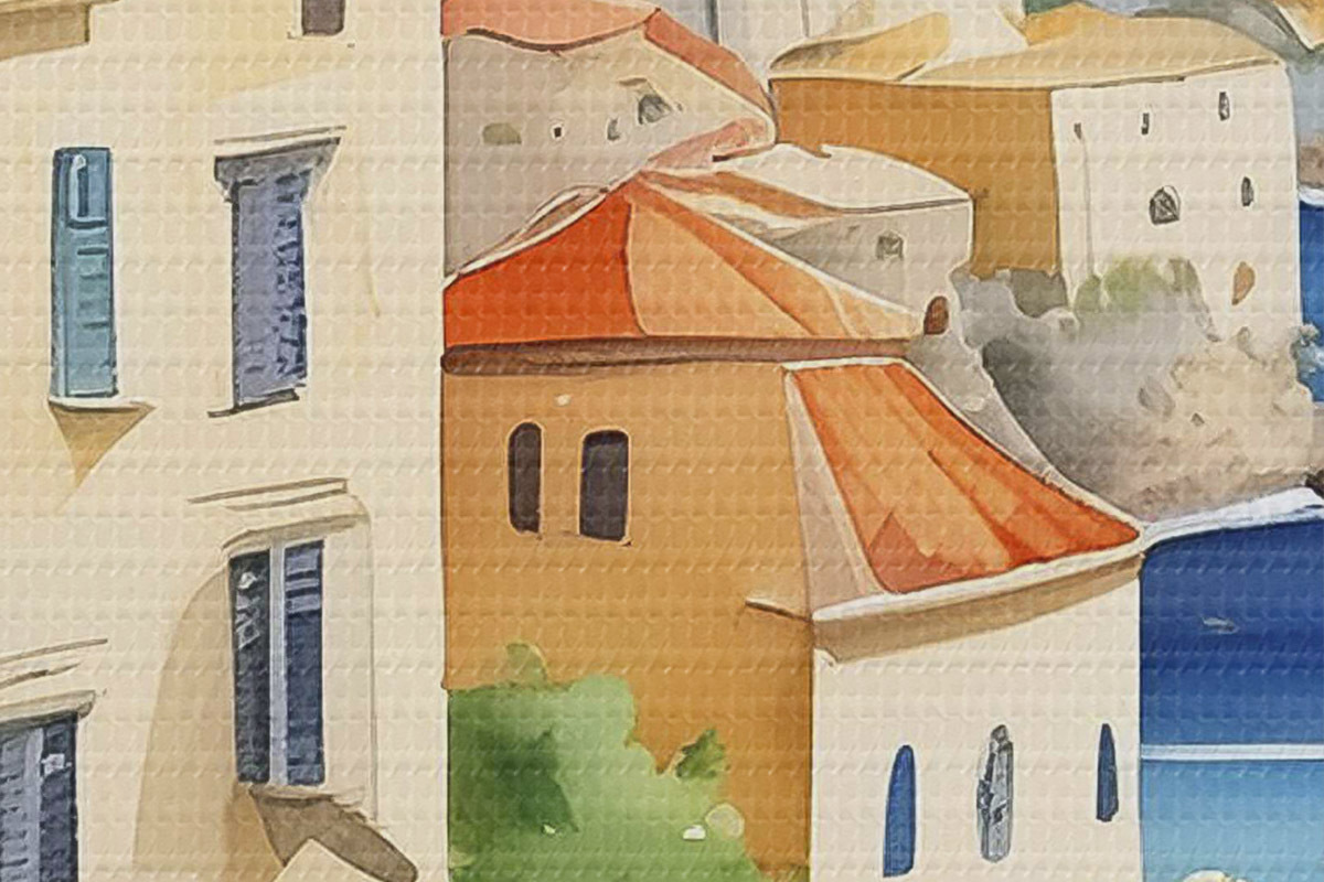 Ronde schilderijen Een aquarel van een stad op een heuvel boven de zee Nr r38409