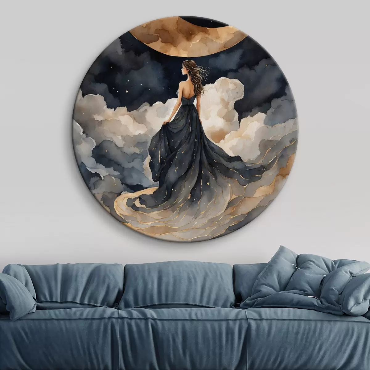 Ronde schilderijen Vrouw in een blauwe jurk en de maan aan de hemel r38428
