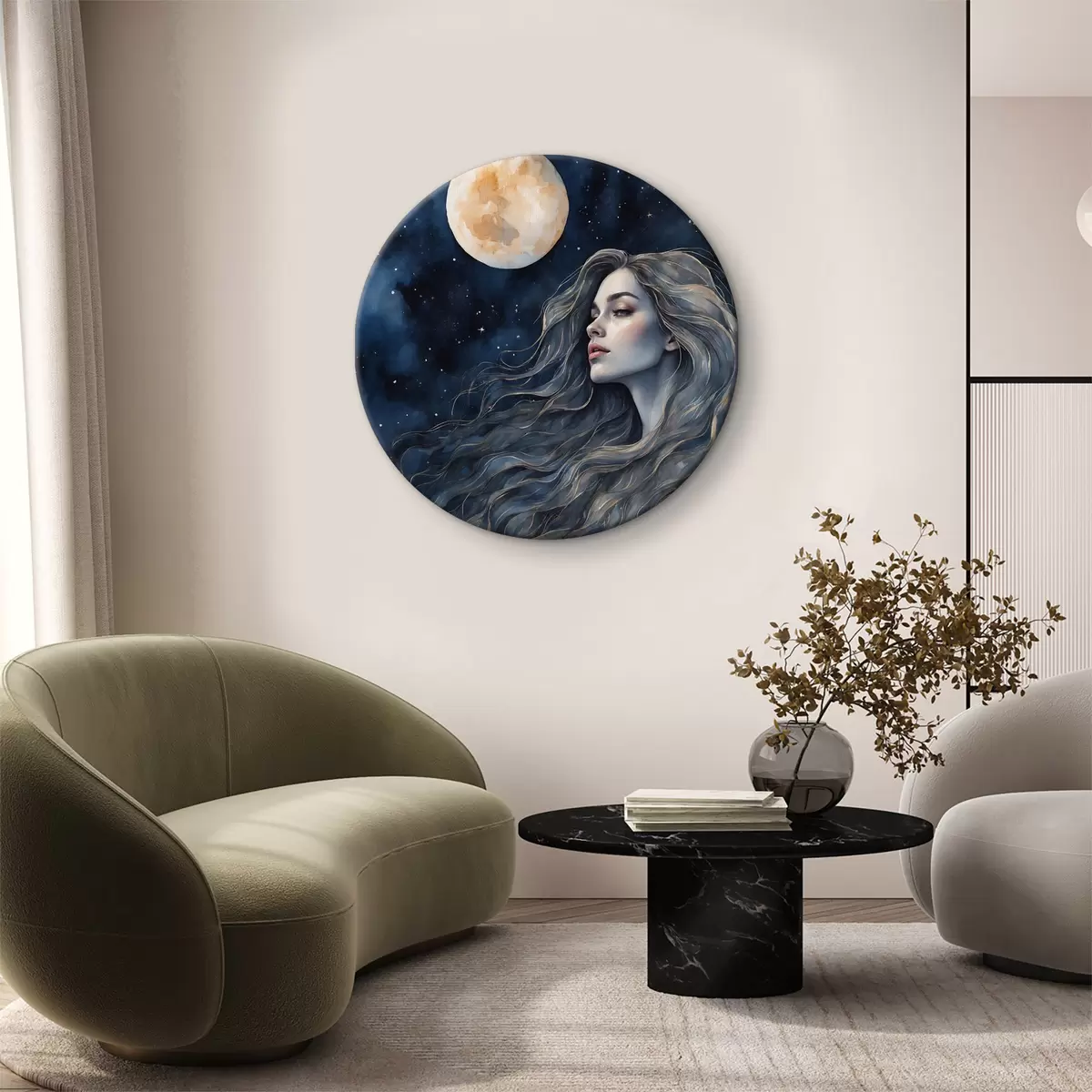 Ronde schilderijen Vrouw met lang haar en de maan Nr r38438
