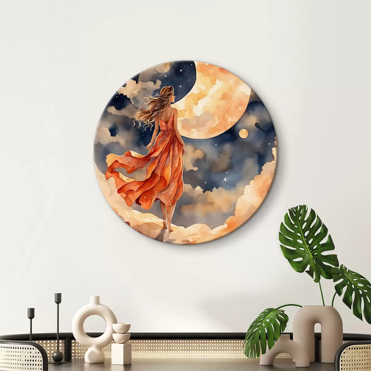Ronde schilderijen Vrouw in een jurk die op een wolk loopt Nr r38440
