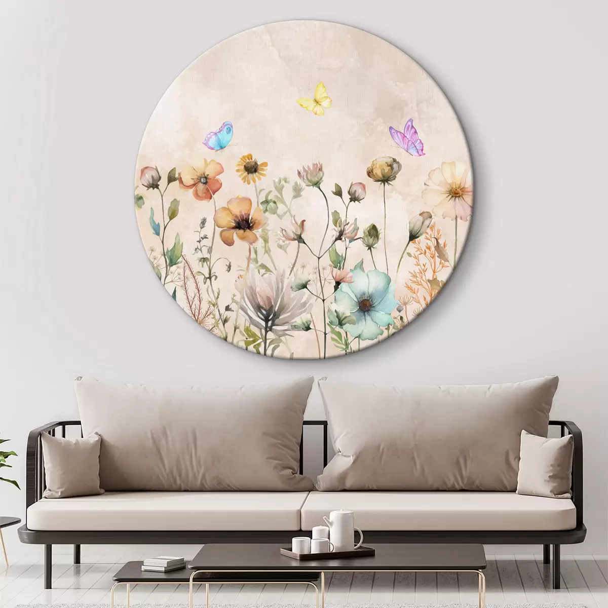 Ronde schilderijen wilde bloemen met aquarellen, heldere vlinders, pastelkleuren Nr r38441