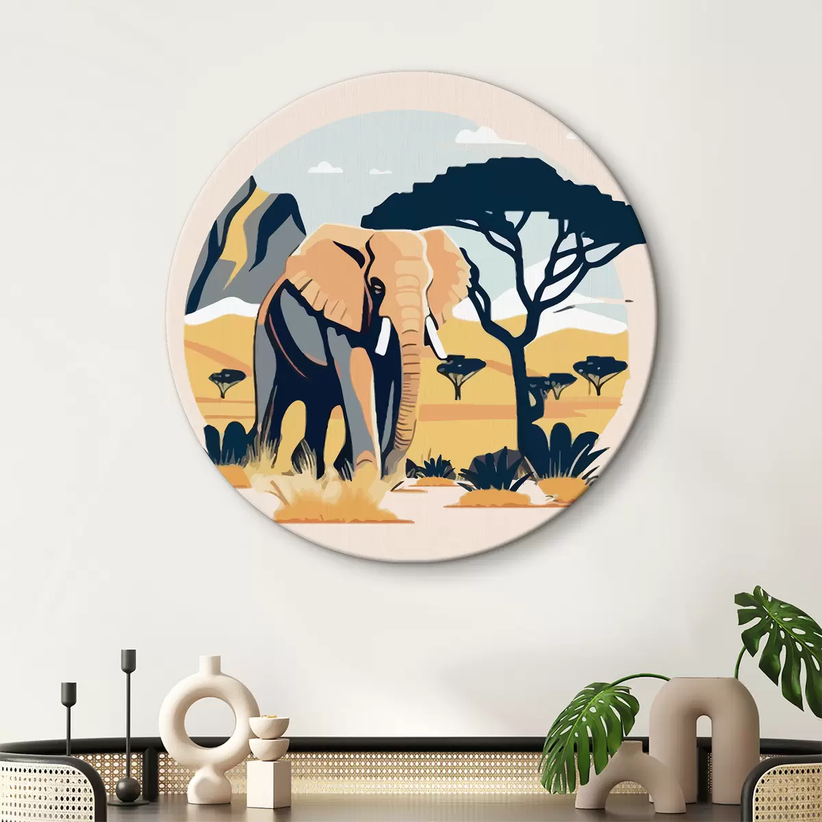 Ronde schilderijen olifant, bomen, bergen, safari, pastel Nr r38448