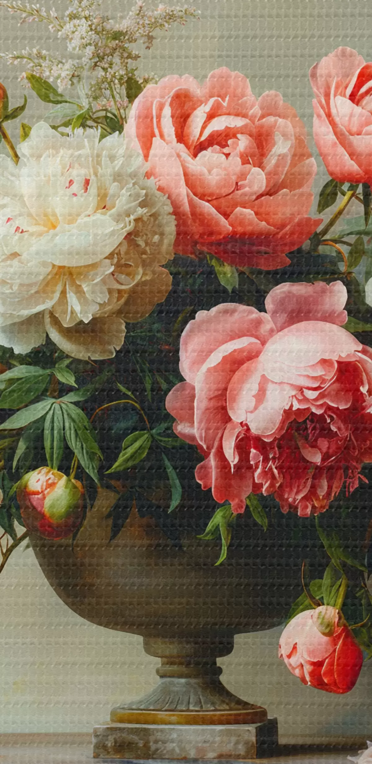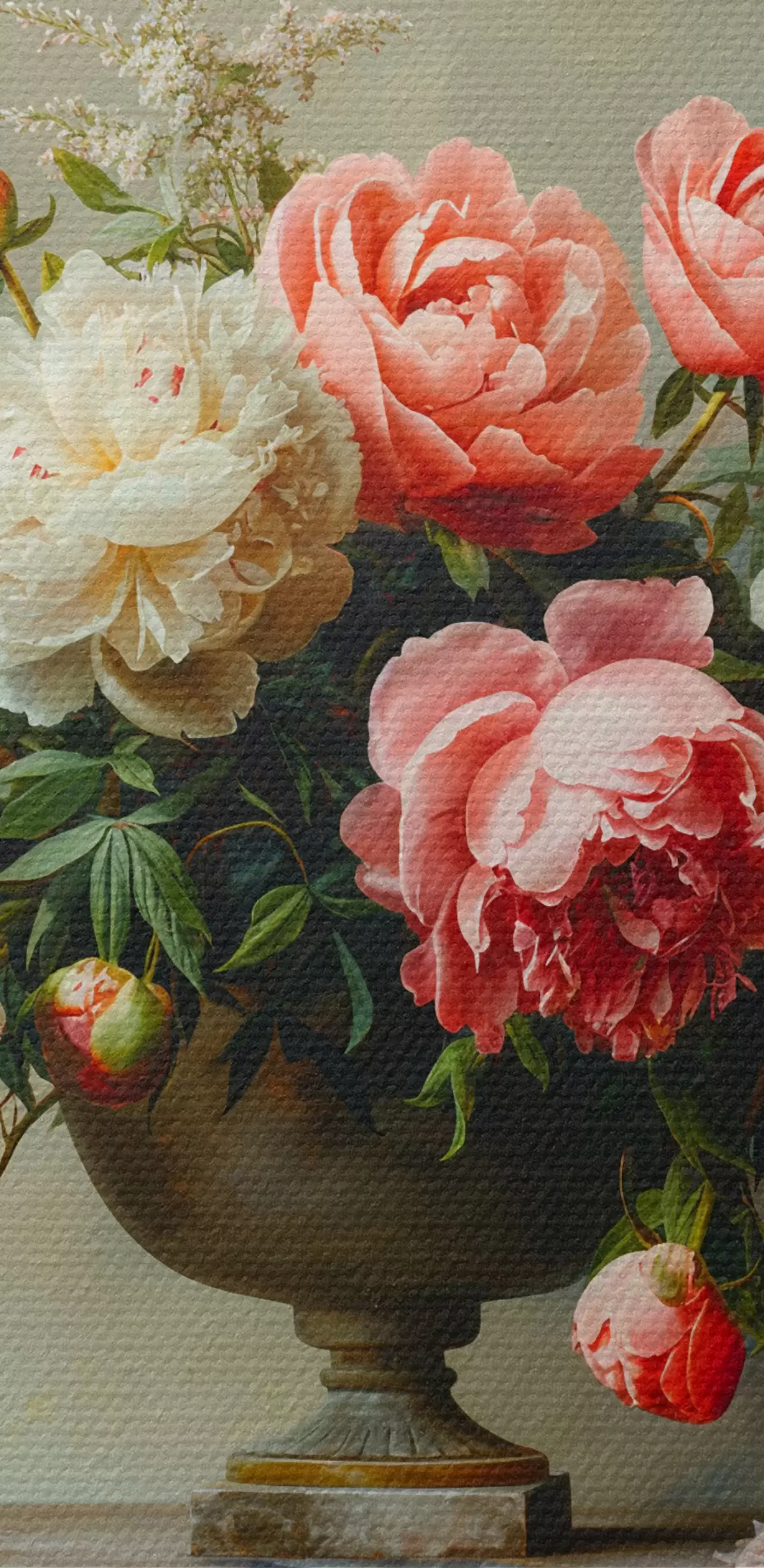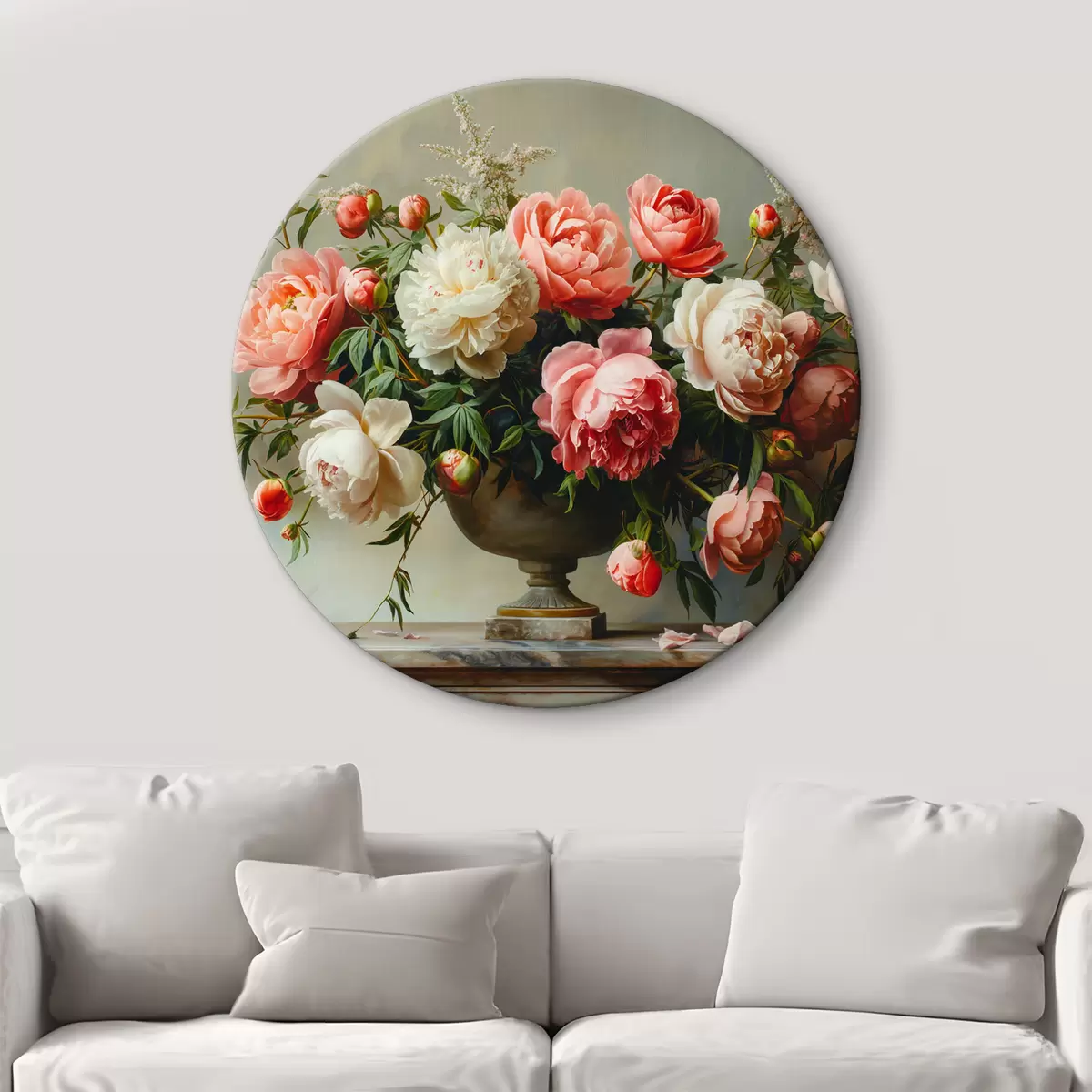 Ronde schilderijen Weelderig boeket pioenrozen en een zwarte vaas Nr r38460